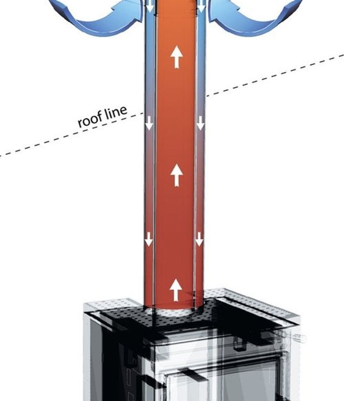 Ethos Woodfires EconAir Induction flue system consists of two flue pipes which extend from the firebox all the way above the roof line. This flue is bi-directional, and draws all its combustion air from outside via the flue outer layer. You can maintain the integrity of your airtight home and meet the Passivhaus Standards, while still enjoying the benefits of a roaring wood fire thanks to Ethos.