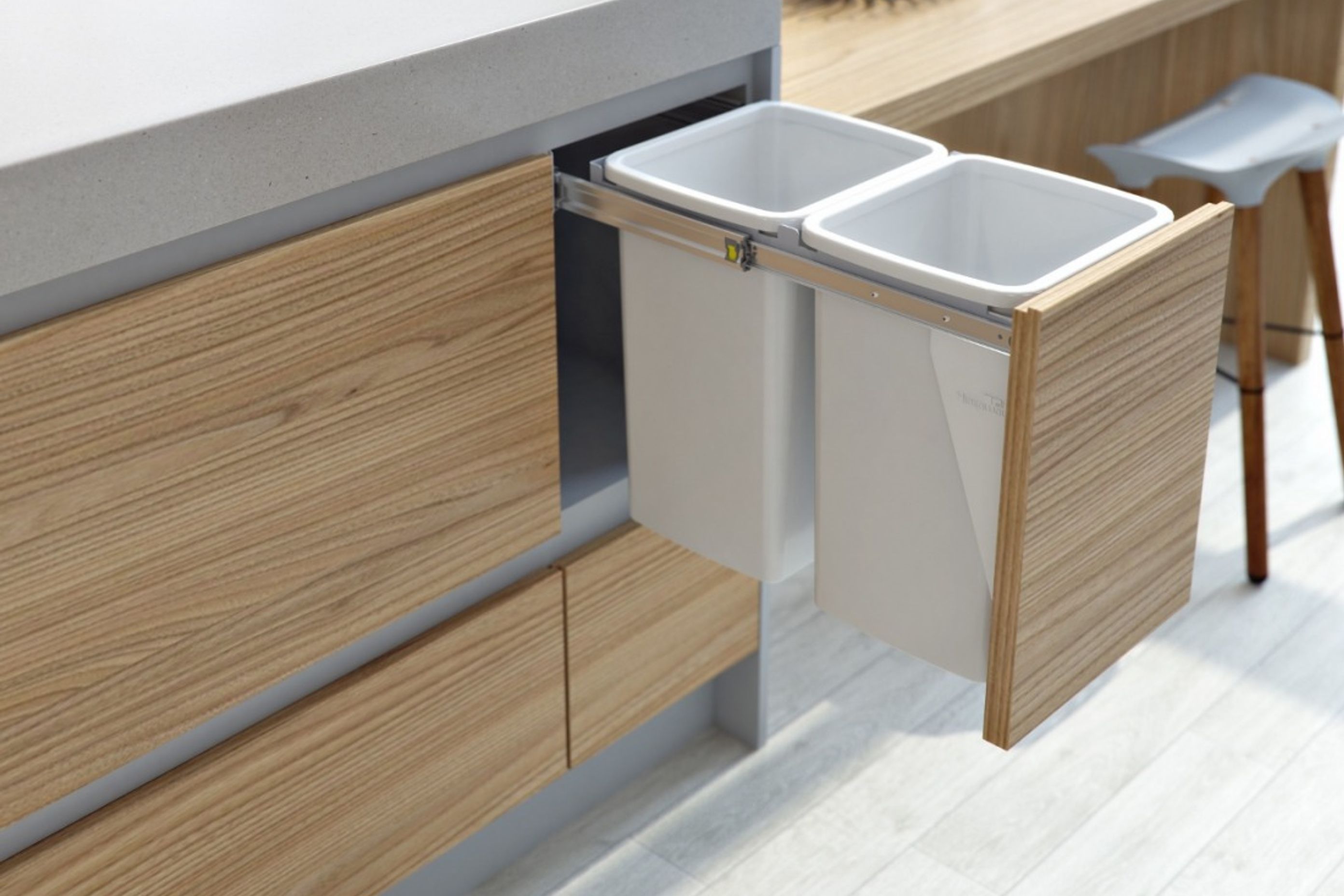 “By using the full depth of the cabinet, we are able to make our bin systems narrower, with many options in the Hideaway Compact range fitting 300mm or 350mm wide cabinets”, Bertelsen says. “This offers a significant space saving over many European bin systems, which is critical when designing for smaller spaces.”