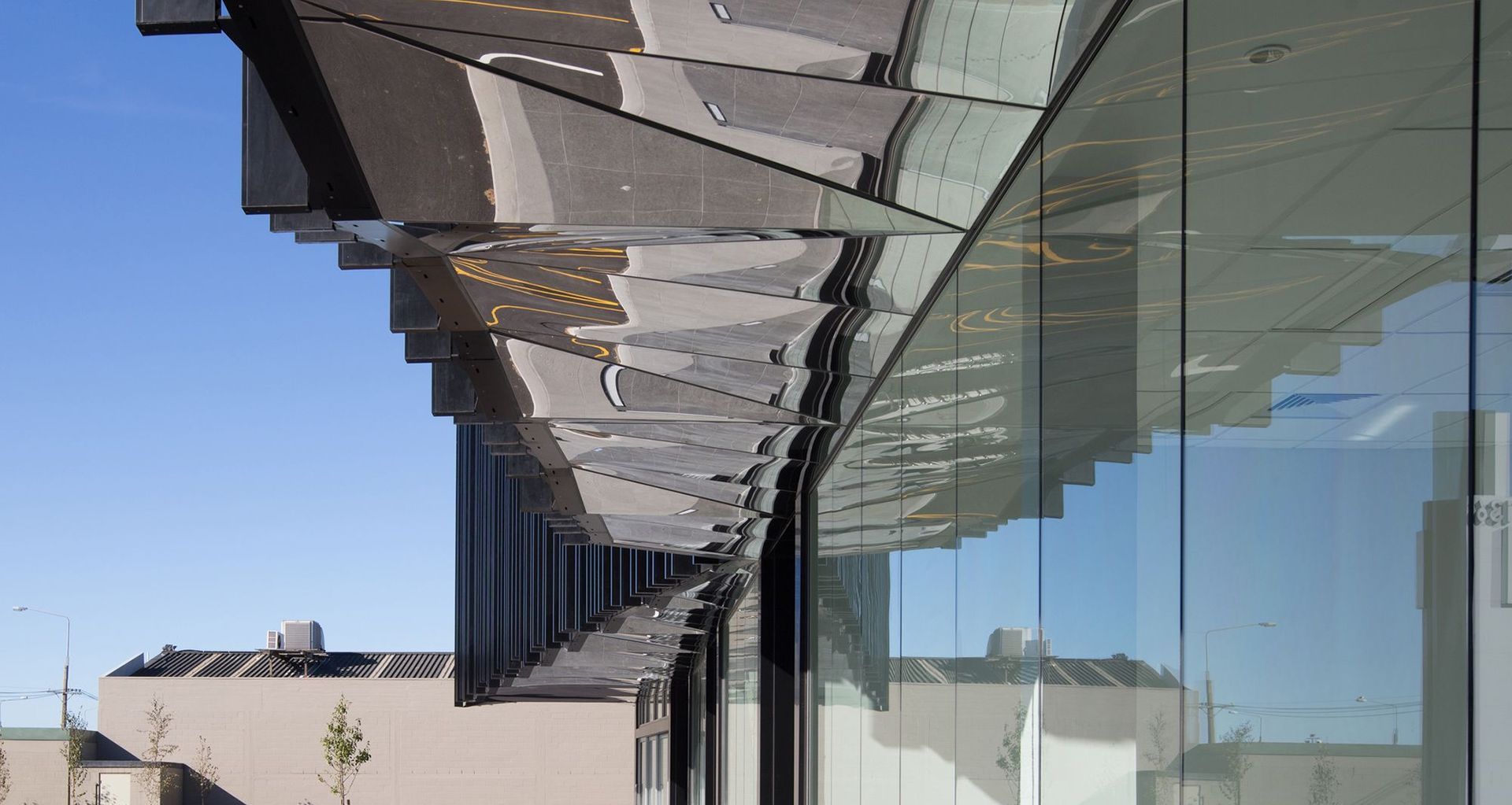 The final part of the façade is the mirror-finish stainless steel faceted soffit, referenced from Paul Pascoe’s Christchurch Airport domestic terminal, which was being demolished at the time.