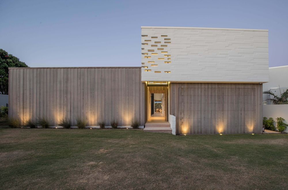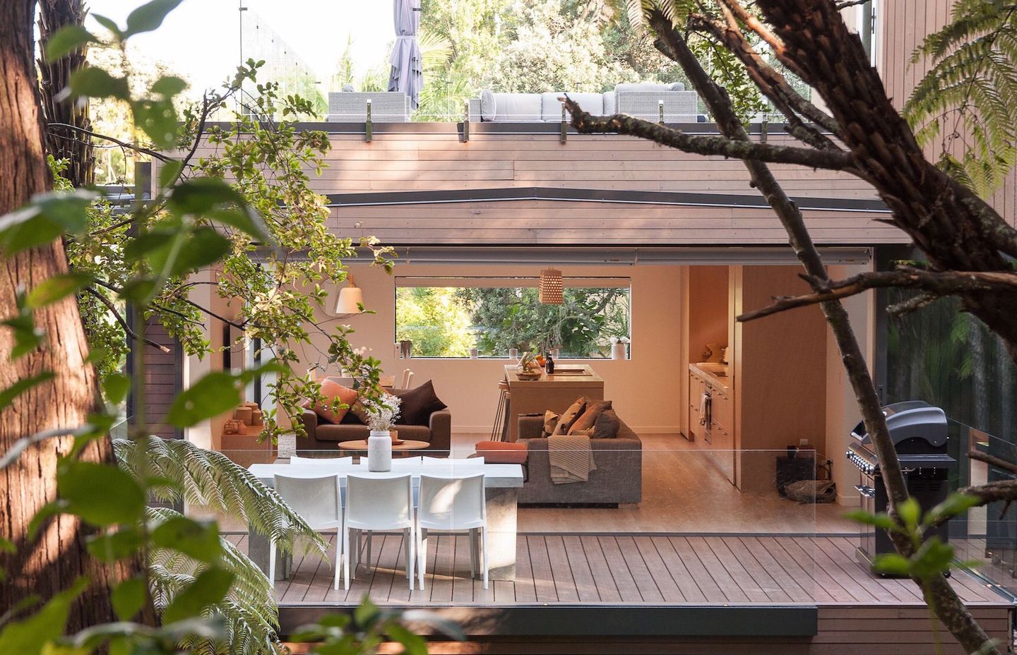 The interior of the house already featured a number of different timbers so, rather than add yet another timber to the mix, the architect has married the cedar plywood soffits and ceilings up with the cedar cladding on the exterior by oiling them with a matching Dryden wood product in the same shade.