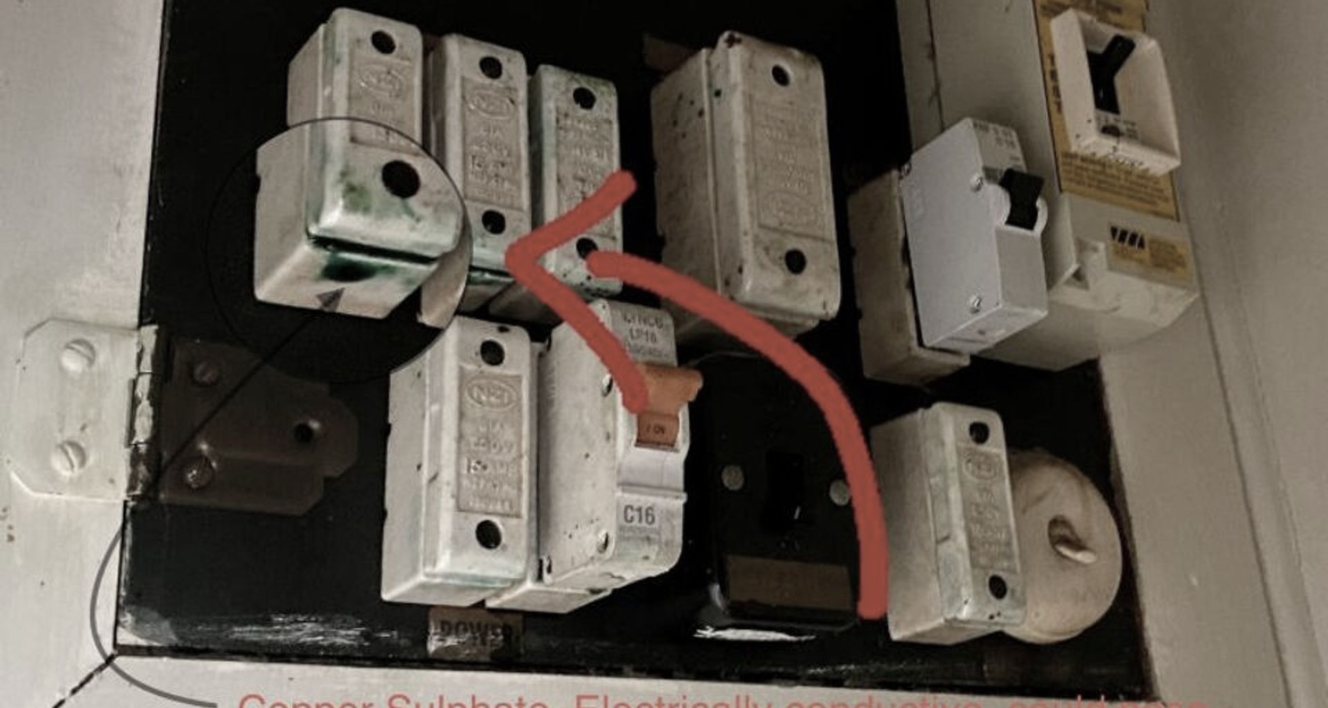 The plasticiser itself is a clear oily liquid that is non-conductive. The green substance is a combination of copper oxide and plasticiser which is conductive. Therefore, whenever this green substance is found at socket outlets and Main Switchboards etc. it should be removed and the terminations cleaned (gloves should be worn) otherwise it is possible that tracking/overheating may occur.