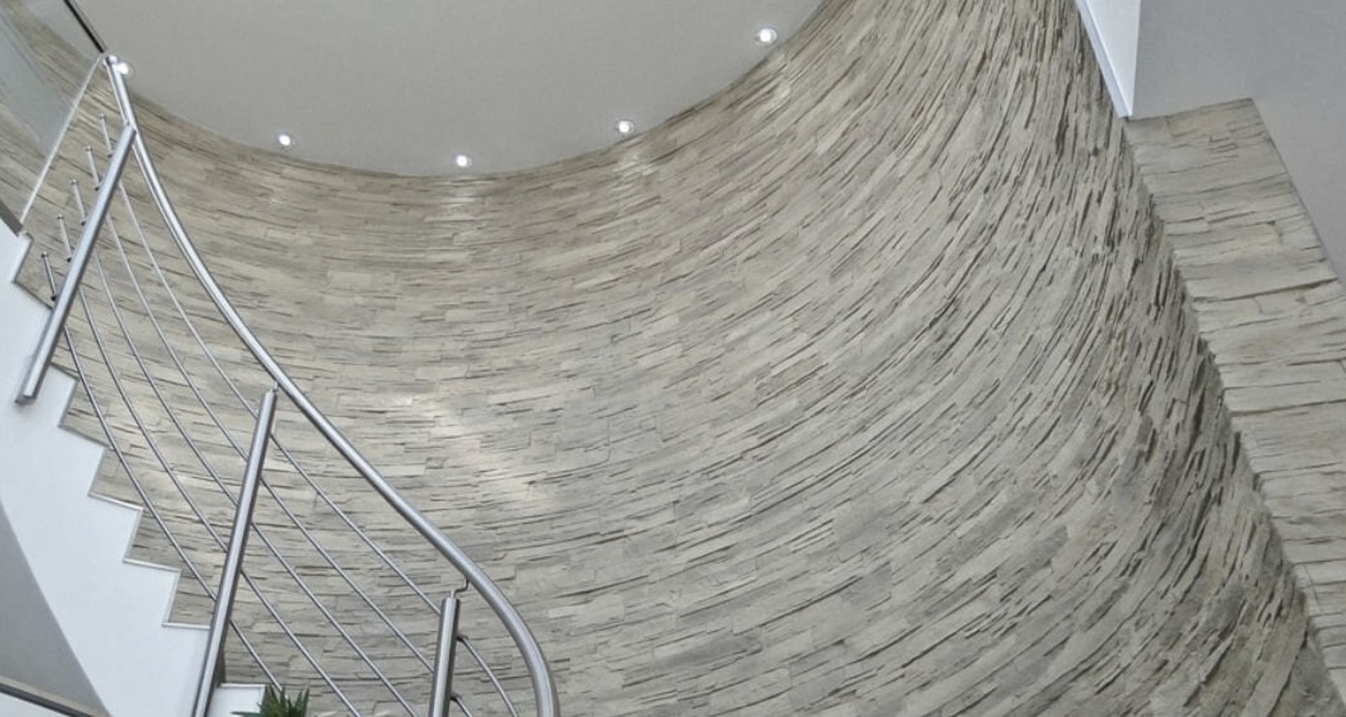 The large and lightweight panels – approximately 30kg per 4m² – create vaulted ceilings without the need for expensive structural engineering and finding craftsman with appropriate masonry skills. The degree of flexibility of bend varies between design and depth of panel. For instance, the 3.3m long Muros Roughcast Concrete panel can be almost curved into a full circle. See examples here of curved wall projects by Muros.