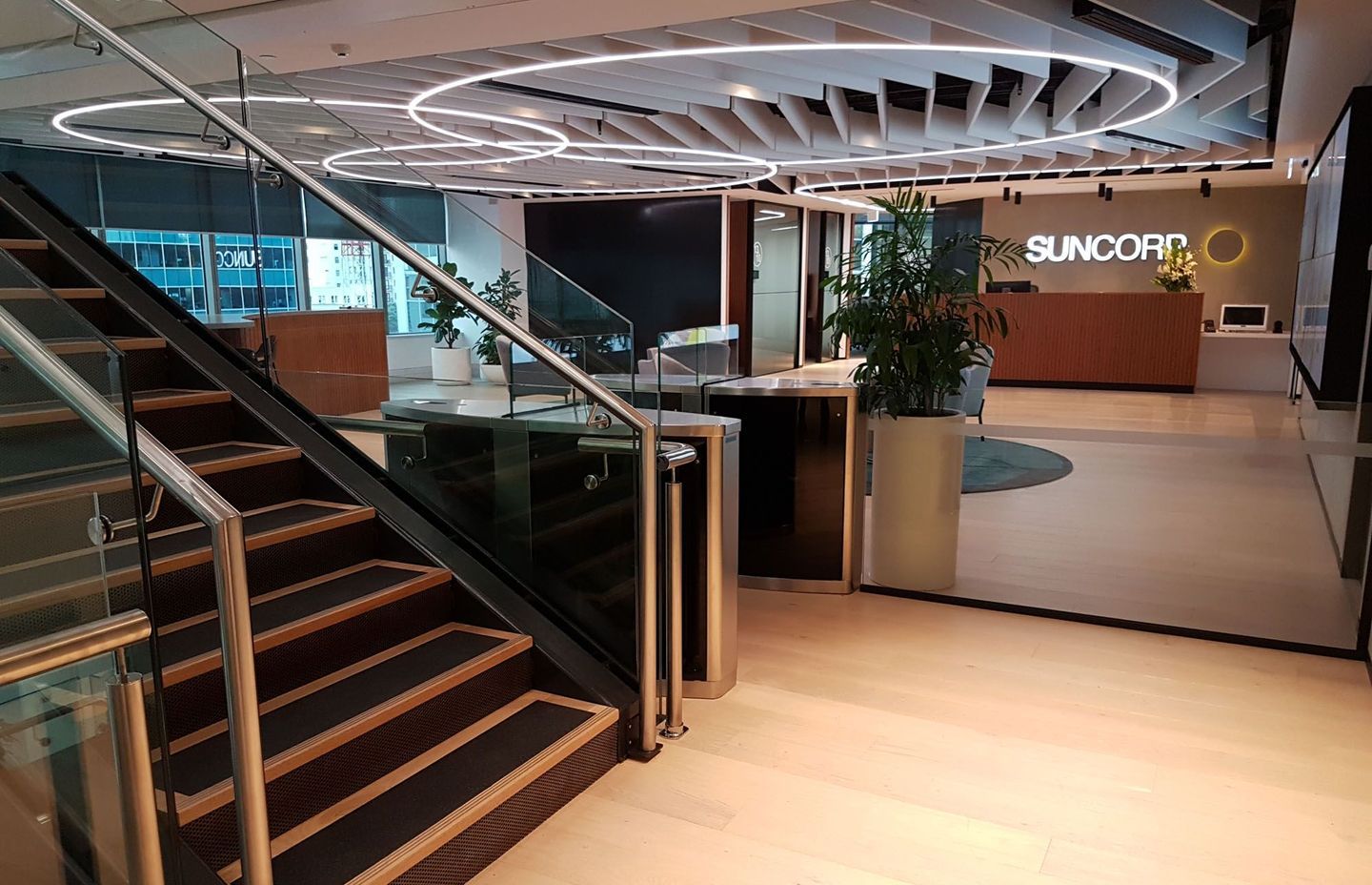 In the Suncorp building, the stair cuts through four levels, which was no mean feat; the builders had to slice a stairwell through four concrete floors to accommodate it.