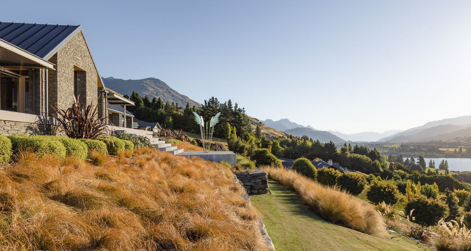 With such a breathtaking backdrop, it’s no surprise that the site and surrounding environment heavily informed design decisions. “We engaged with local mana whenua, working alongside them to develop the cultural paving pattern which represents the Kawarau maunga and Lake Wakatipu. Locally sourced stone, timbers, and planting all provide a direct connection to elements specific to this site. We also wanted to embrace the surrounding scenery and location, so framing views and ‘borrowing’ elements from the landscape were key.”