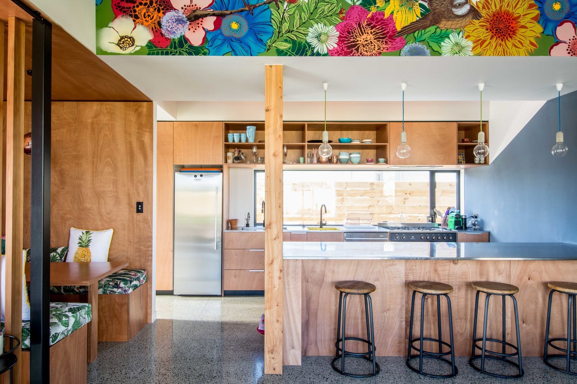 Lighting above the kitchen bench is either pendants (perhaps three different shapes/forms but in the same collection) or track lighting which suits a cleaner, more stylised look. Box tends to install lighting under high-level cupboards.
