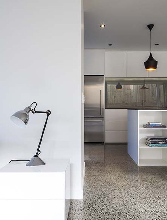 LED bulbs are preferred in recessed ceiling lights for their energy-saving qualities and, for a contemporary look that suits the modernist mood, we tend to specify black casings (on a white ceiling) that can tilt to direct the light.