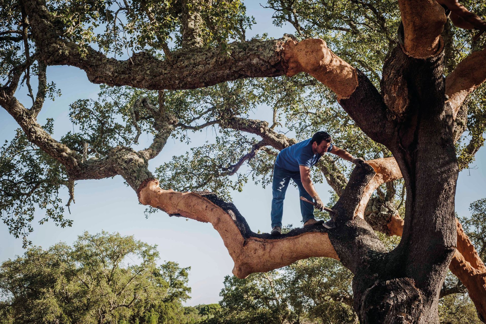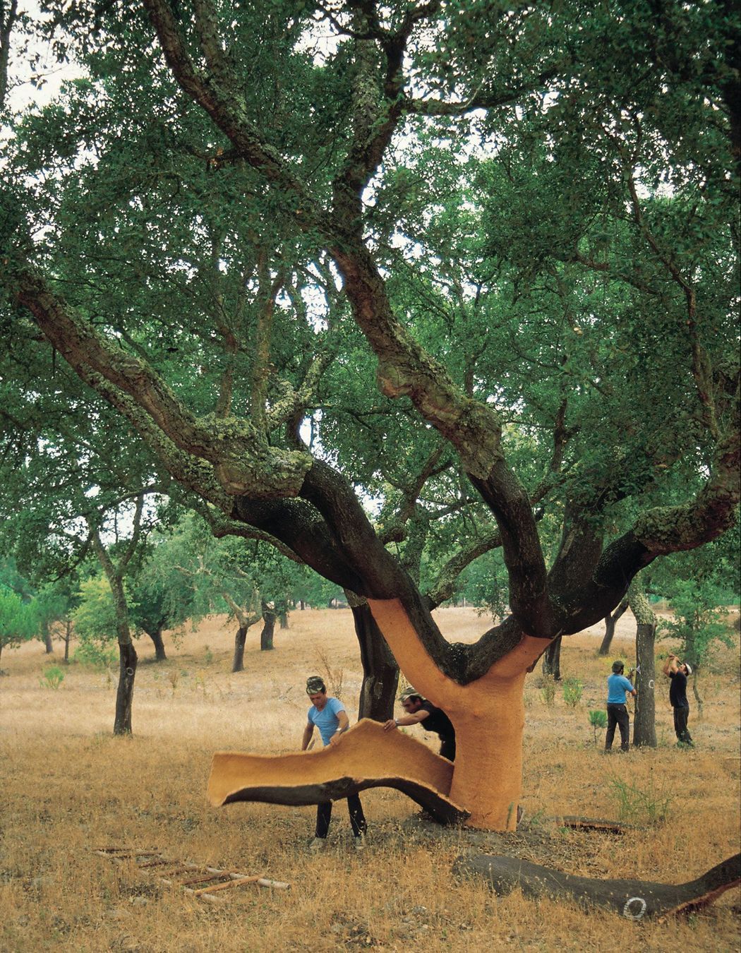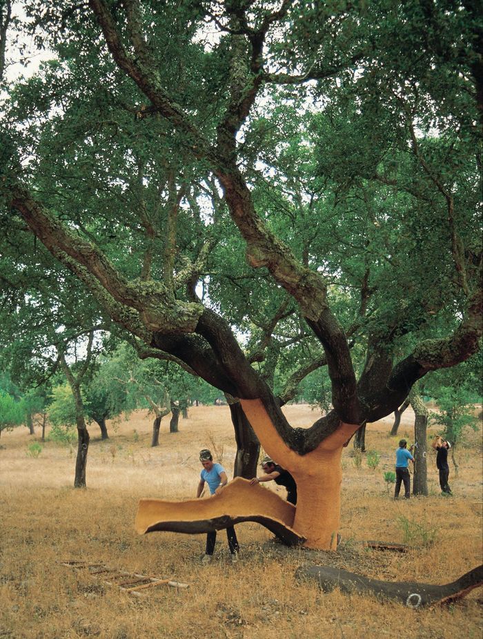The stripping of cork is an ancient process in which the bark of the cork oak is removed with an axe. This work is one of the highest paid agricultural jobs in the world today due to the specialised knowledge required to strip the bark without damaging the tree. In Portugal, the stripping of cork takes place between May and August each year, when the trees are growing at their fastest. No trees are felled during harvesting of cork, and they are not damaged in any way if the cork is harvested correctly.