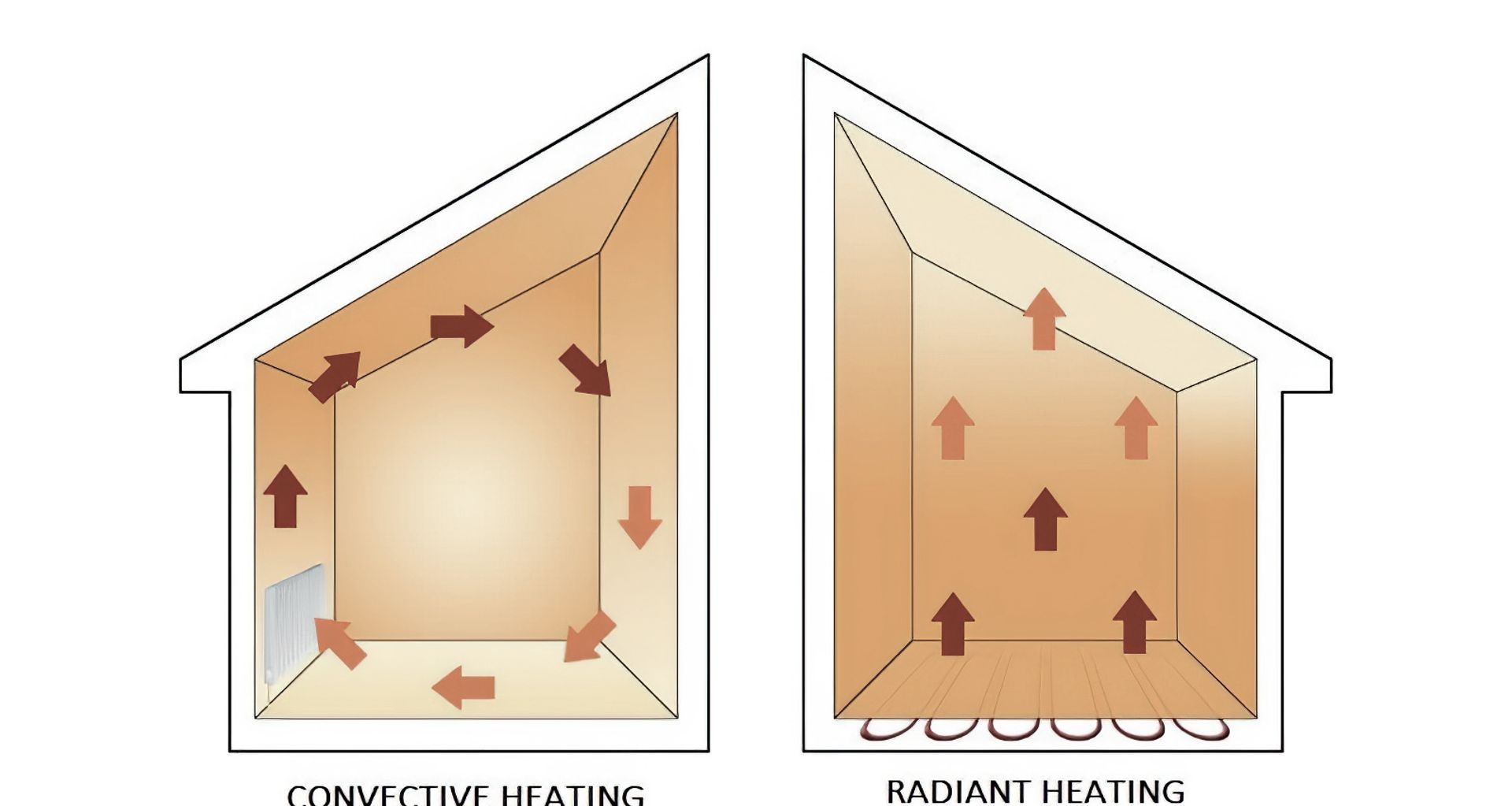 Convective heat (i.e. ducted air or reverse cycle aircon) is where air is warmed up and physically blown throughout the room. A person feels the warm air being blown across them. This creates convection currents within the area, where the hot air rises to the ceiling and the cool air sinks to the bottom. The downside to convective heating is that you will need to heat the entire room from the top down, just for it to reach you.