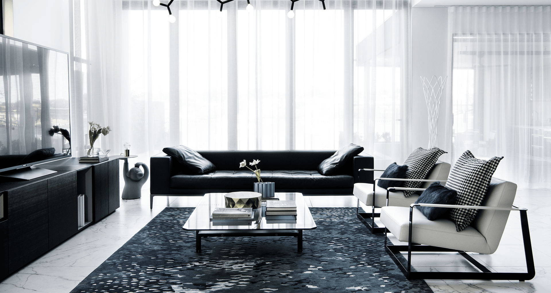 When it comes to dividing a room, we often think vertically; with screens, shelving units, and portieres coming to mind. However, thinking horizontally can be just as effective. Rugs can be used to define areas in open-plan spaces while maintaining a cohesive interior design style and have the added benefit of not making a space appear smaller.