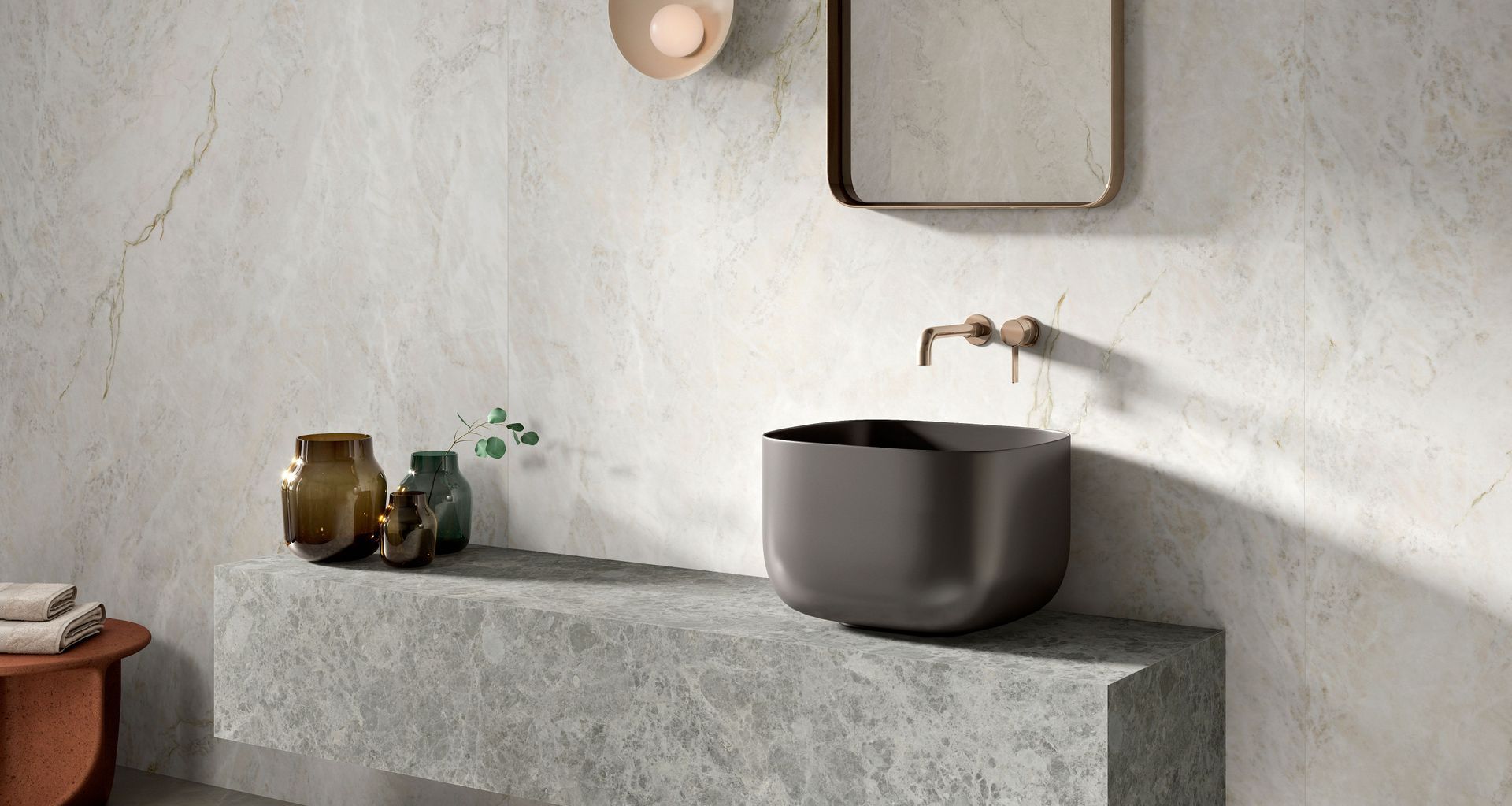 Tactile stone in nature-drawn hues such as Neolith Everest Sunrise and Neolith Cappadocia Sunset sits effortlessly alongside timber, concrete, richly textured upholstery, brass and copper in bathrooms, kitchens and living spaces, creating an earthy and inviting aesthetic.