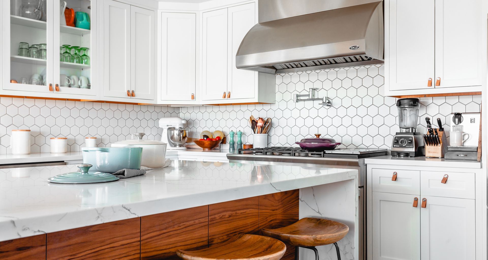 - All-White Minimalism: You cannot go wrong with white. Incorporating white cabinets and countertops can make your space look larger. Try adding a bit of contrast with light silver appliances and kitchen tools to give your kitchen space a homier feel.