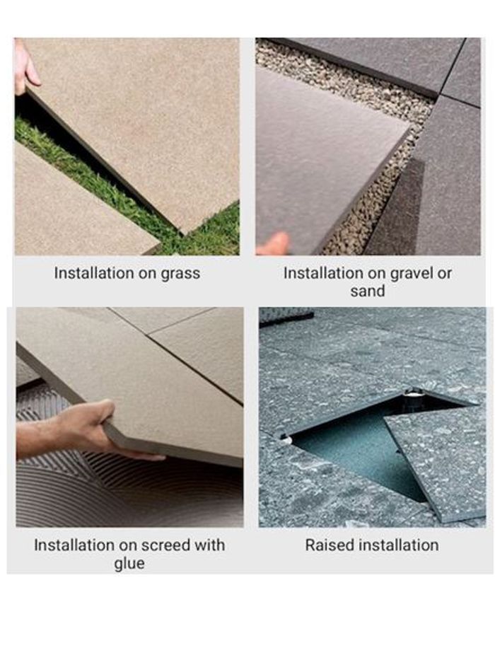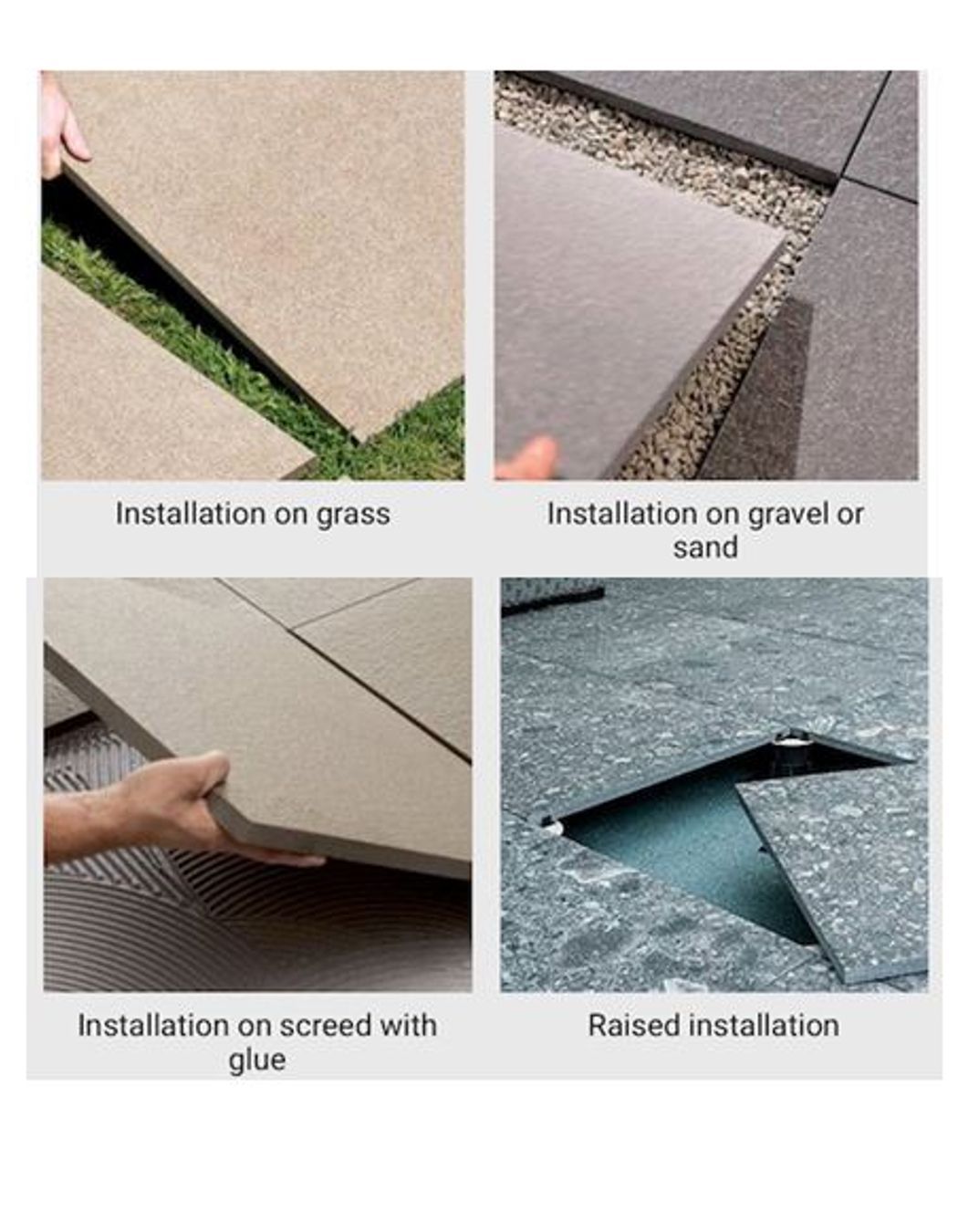 The increased thickness (twice that of traditional porcelain tiles) has numerous benefits. Not only does it guarantee a high resistance to loads and stresses but it also facilitates an array of installation methods. From dry laid onto sand, gravel and soil, glued to a solid surface, or installed on elevated deck jack systems like VersiJack; they are easy to lay and provide superior wear, performance and versatility.
