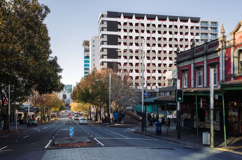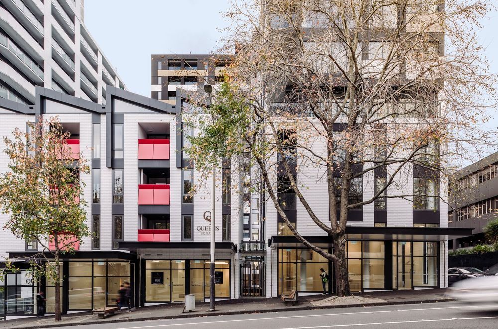 The group of three buildings called Queens Square was designed to be occupied by those students who study in the area – whether at AUT, the University of Auckland or nearby language schools – and has a domestic flavour with flamboyant flourishes that set it apart from surrounding buildings.