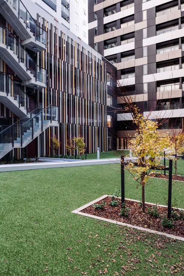 The three buildings wrap around a central plaza, containing gardens, a gathering space, a communal pool and gymnasium. Because all apartments are entered through the plaza it acts as a social centre and community hub. Leuschke says the journey from Queen Street through the plaza is one that breathes life and connection into the development.