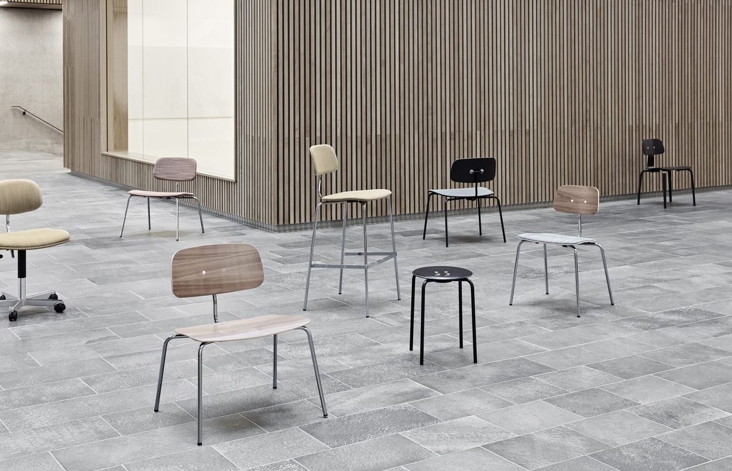 Initially, the Kevi chair incorporated a five-star base on double wheel casters - a seat imagined as an office chair. Today, the Kevi chair is available in various forms ranging from a stool to a four-star base, and in different materiality.