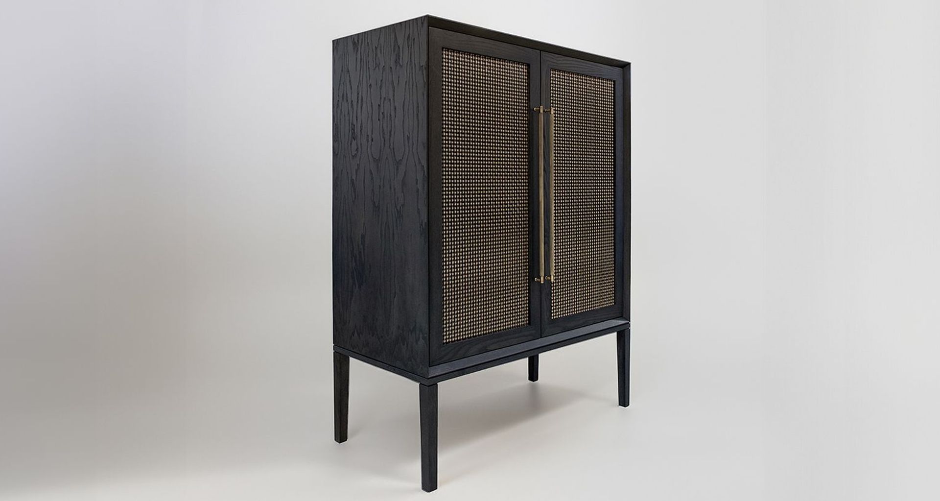This 2 door bar cabinet in veneered American Ash wood, with a charcoal stain finish, features woven antique brass door inserts, Berkley antique brass handles, adjustable internal wooden shelves and integrated LED lighting.