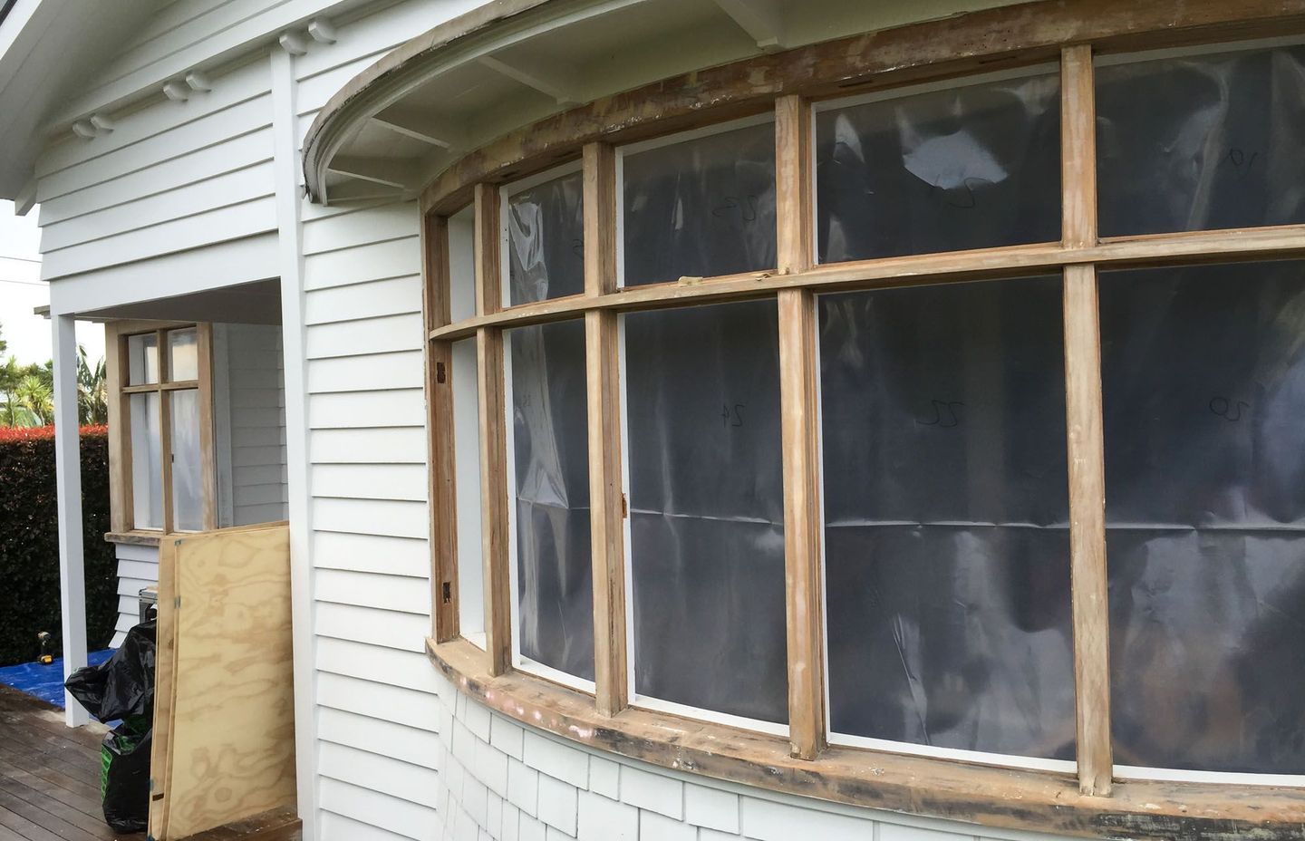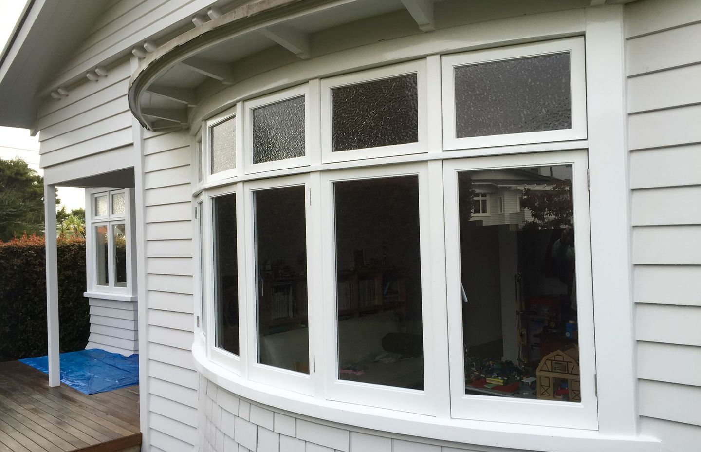 Recently, we completed a project to refurbish some timber windows, including changing fixed sashes into awning hung sashes, and retaining the existing decorative glass. Here, refurbishment was the preferred option. The windows were in total disrepair. The paint, hinges and glazing putty had all gone. But the timber frame was still fine with no rot. The Kauri and Rimu timber was still hard, very dry and took a nice shaving after many decades of exposure. The glass was beautiful, with a deep profile, much like crystal, and the sun light dancing through it was really spectacular.