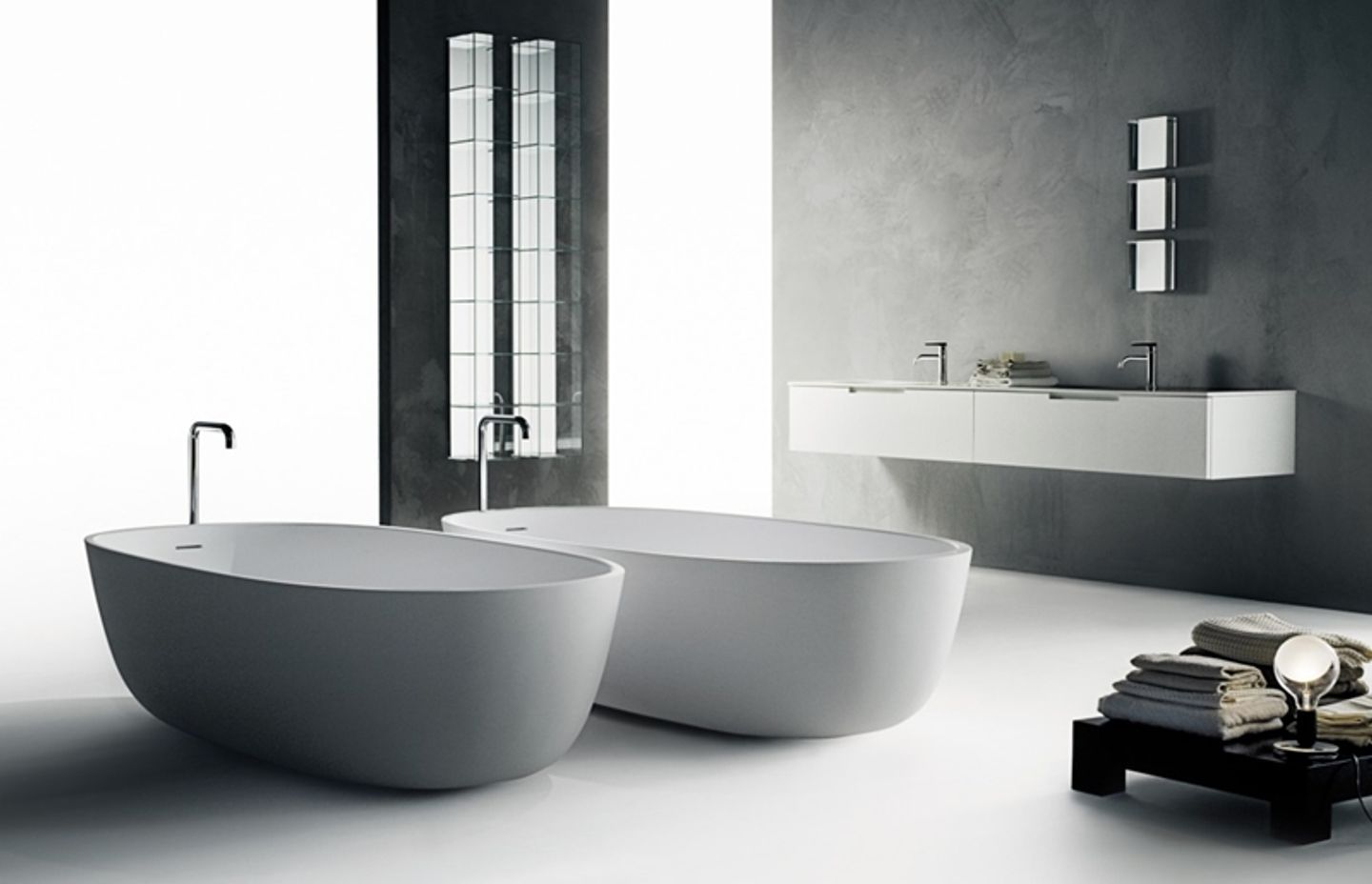 Some quirky designers recommend mixing and matching contemporary aesthetics with vintage classics, such as using marble flooring or modern neutral-tone floor tiles but installing an ornate, antique tub with claw feet. An alternative is to embrace a clean all-white minimalist tub. There are many options in the freestanding bath range by Boffi.