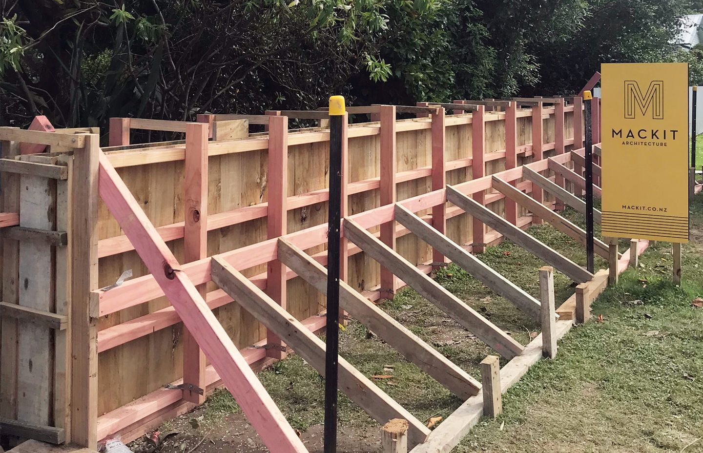 One of the first things we would crack into was fencing – both the boundary fence and the front formed concrete wall. The latter is an extremely time-consuming process, but the result is pretty special. The boxing, which is the mould that the concrete would be poured into, is very time consuming work to do correctly, to ensure there is no risk of ‘blow out’ when the extreme forces of wet concrete are applied. Also, because we wanted the imprint of the timber in the finished product, the boards had to be carefully placed to ensure they would look good once revealed.
