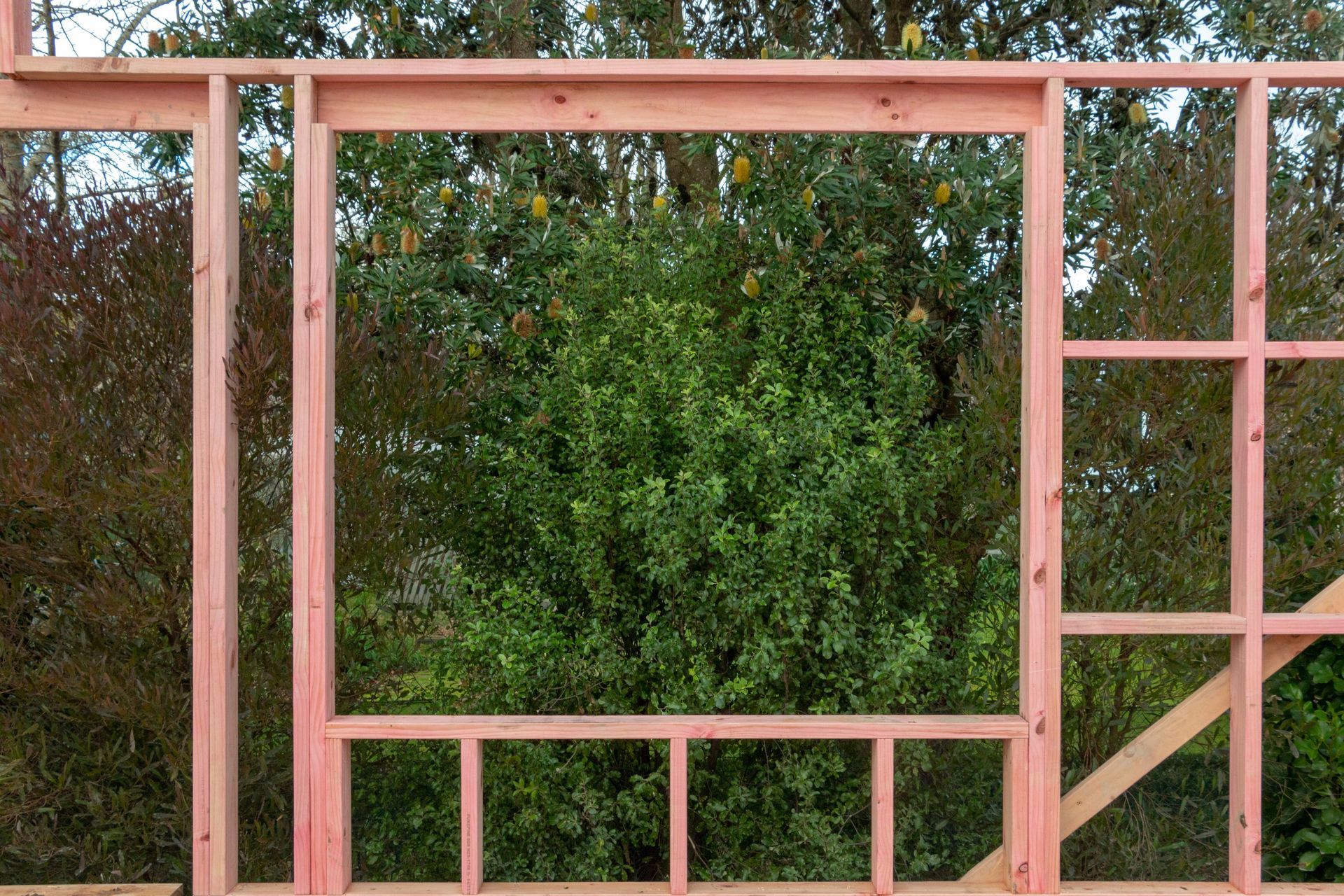 Now with most of the exterior frames up, we can fully walk through the lower level of the house, and appreciate the different views framed by the windows and doors. We are especially appreciating the native planting down the north boundary, which not only provides privacy but a lush verdant outlook for the lower bedrooms, bathroom and kitchen.