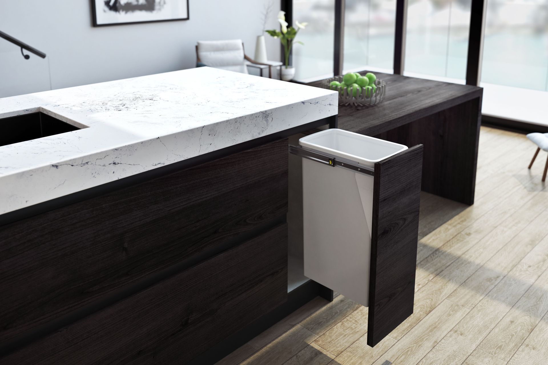 This bin is the newest addition to the Hideaway Compact range, where the top mount panel acts as a cover for the bucket. The high quality steel framework is top mountable and includes additional side mount supports for rigidity. Available as either a door pull or handle pull.