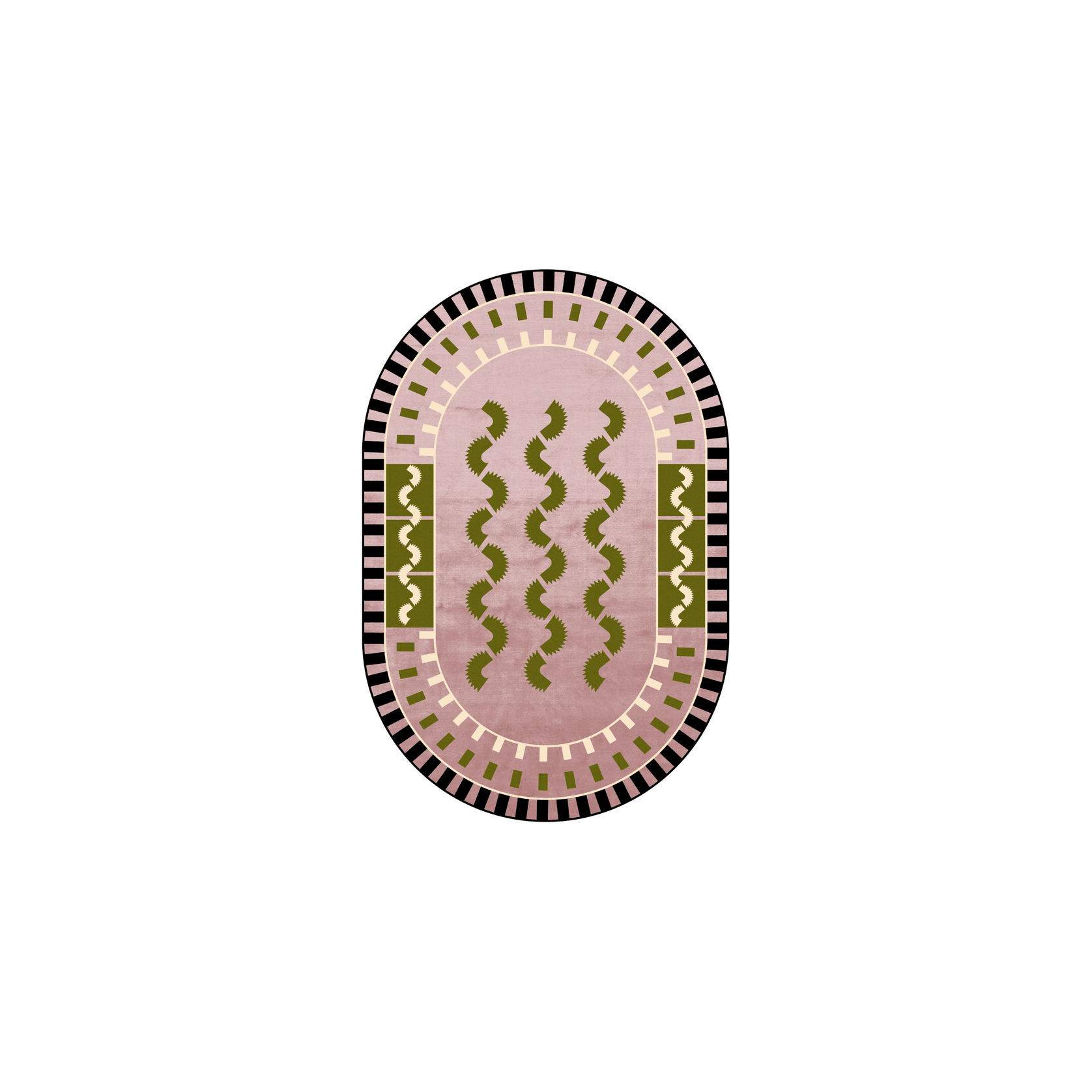 A rug design for residential settings, this geometric oval shape piece features an elegant serpent motif.