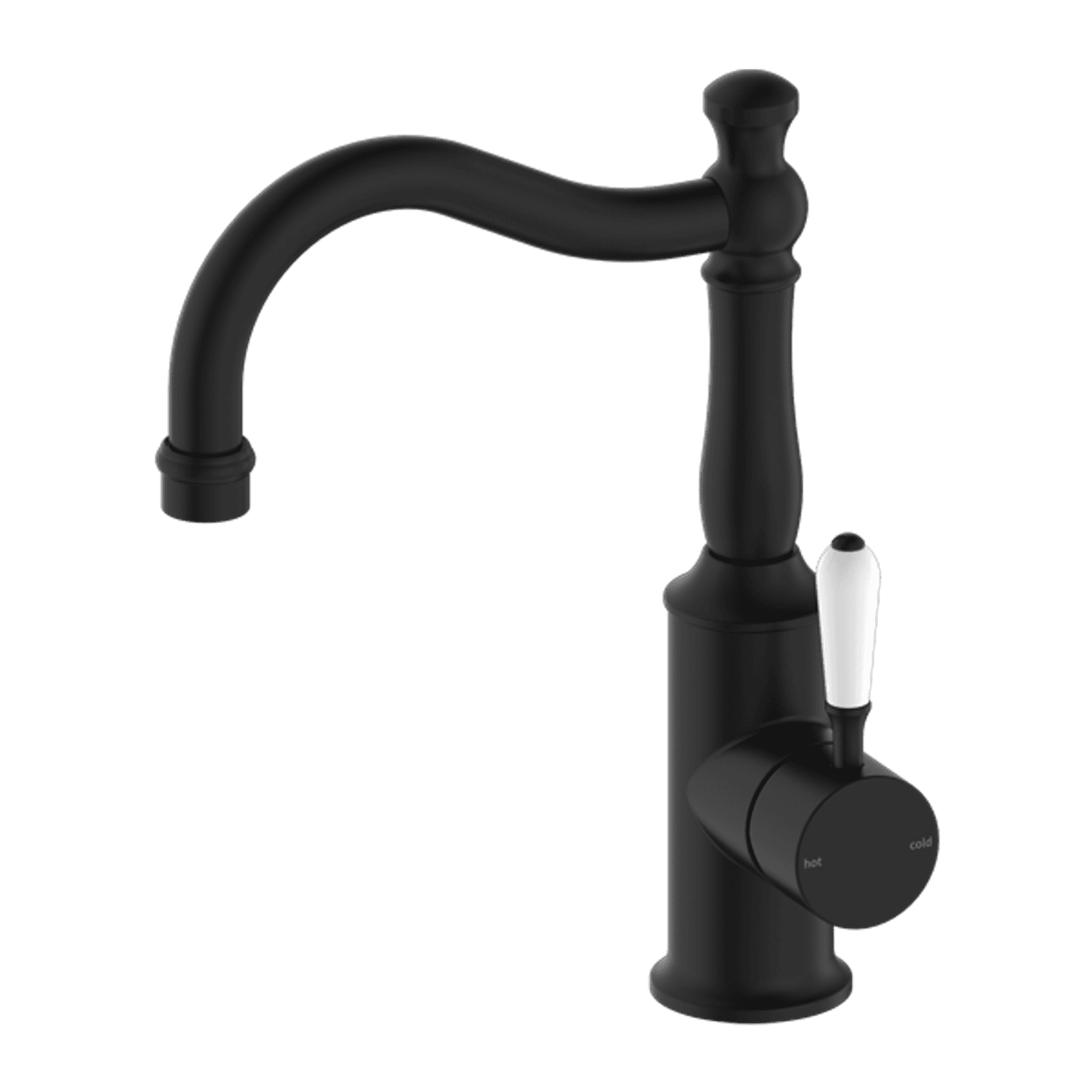 York Basin Mixer Hook Spout With White Porcelain Lever Matte Black