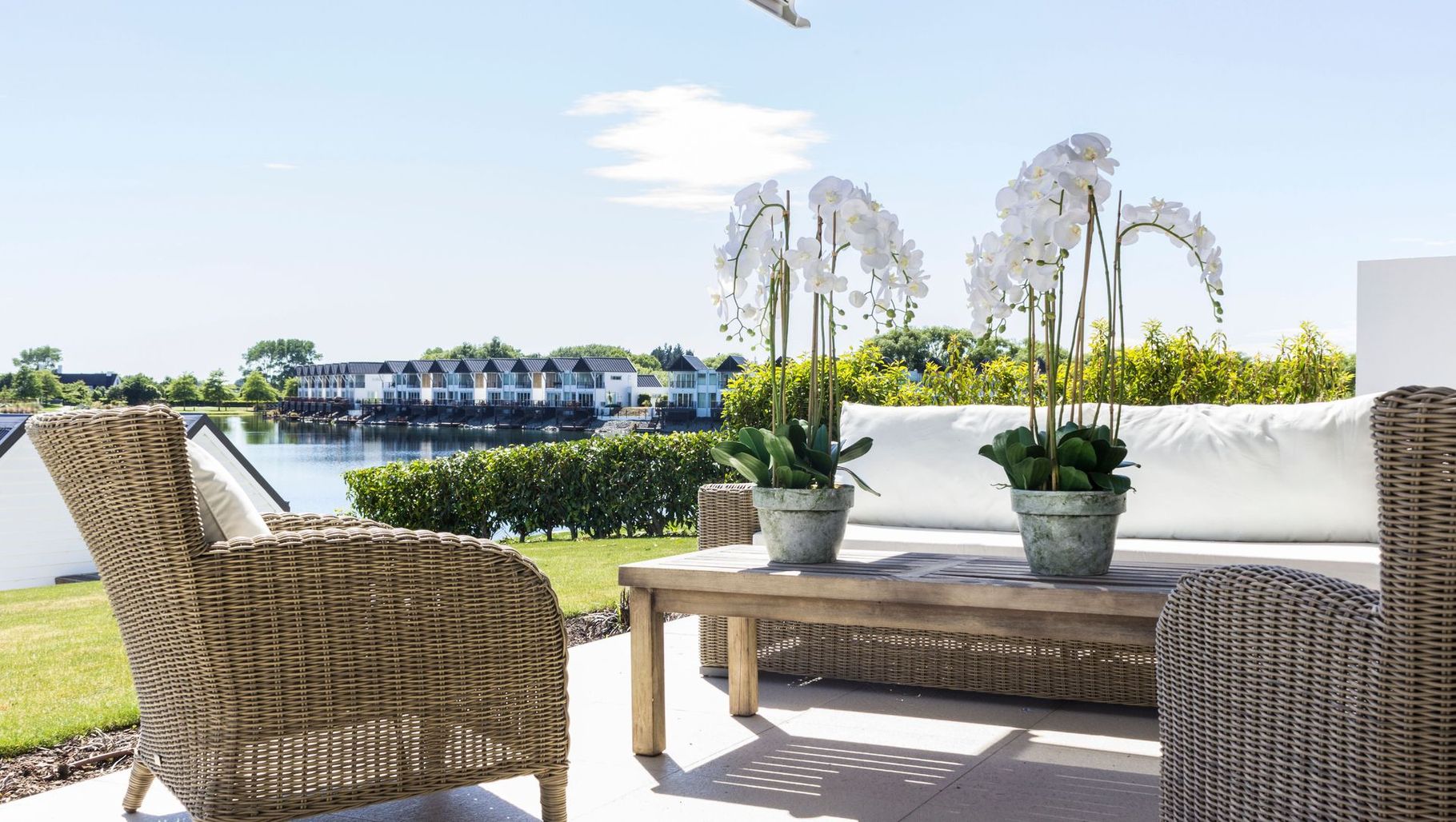 ArchiPro Project Summary - Project 006 features elegant wicker furniture and hardwood elements for a stunning outdoor living space.