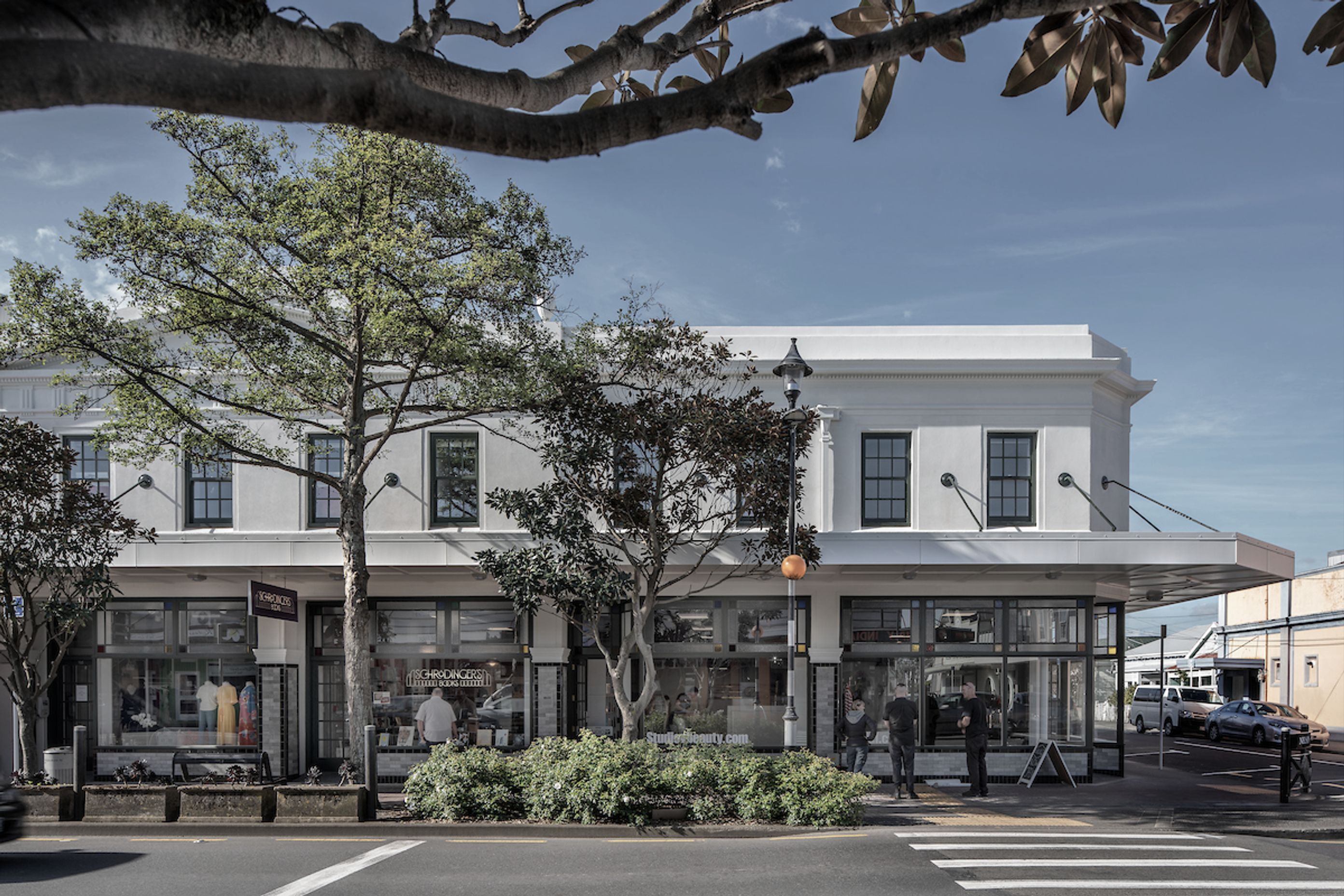 ArchiPro Project Summary - Restoration and redesign of a heritage-listed mixed-use building on Jackson Street, Petone, featuring four shops and four north-facing residential units, blending old and new with recycled materials and modern finishes.