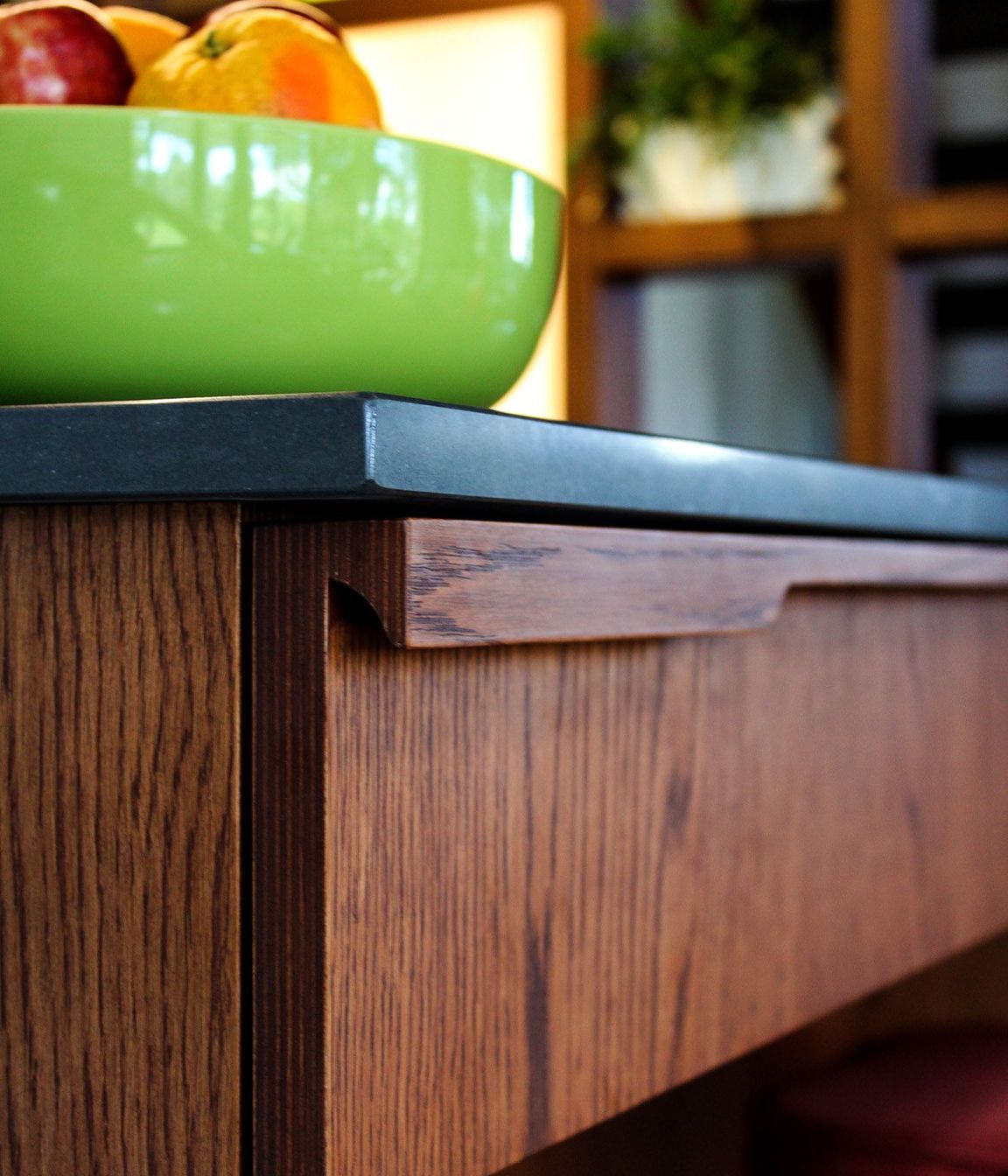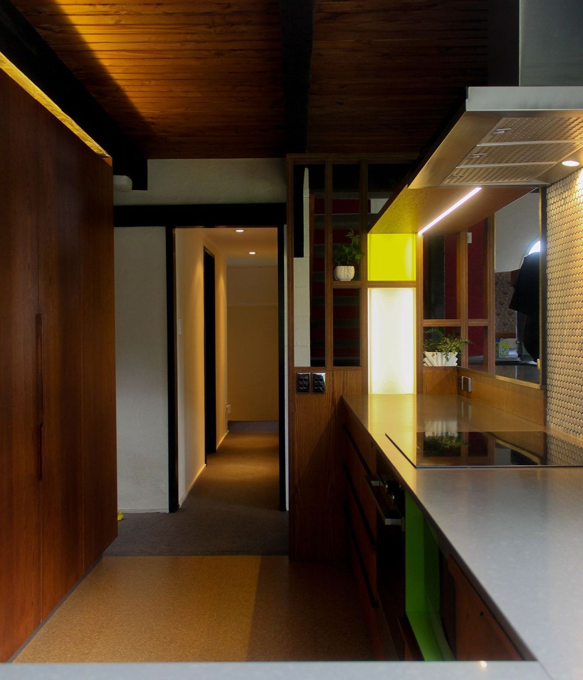 ArchiPro Project Summary - A contemporary kitchen re-fit in a 1970's architect-designed home, blending American oak veneer and lime green laminate to preserve the original character while enhancing functionality with modern amenities.