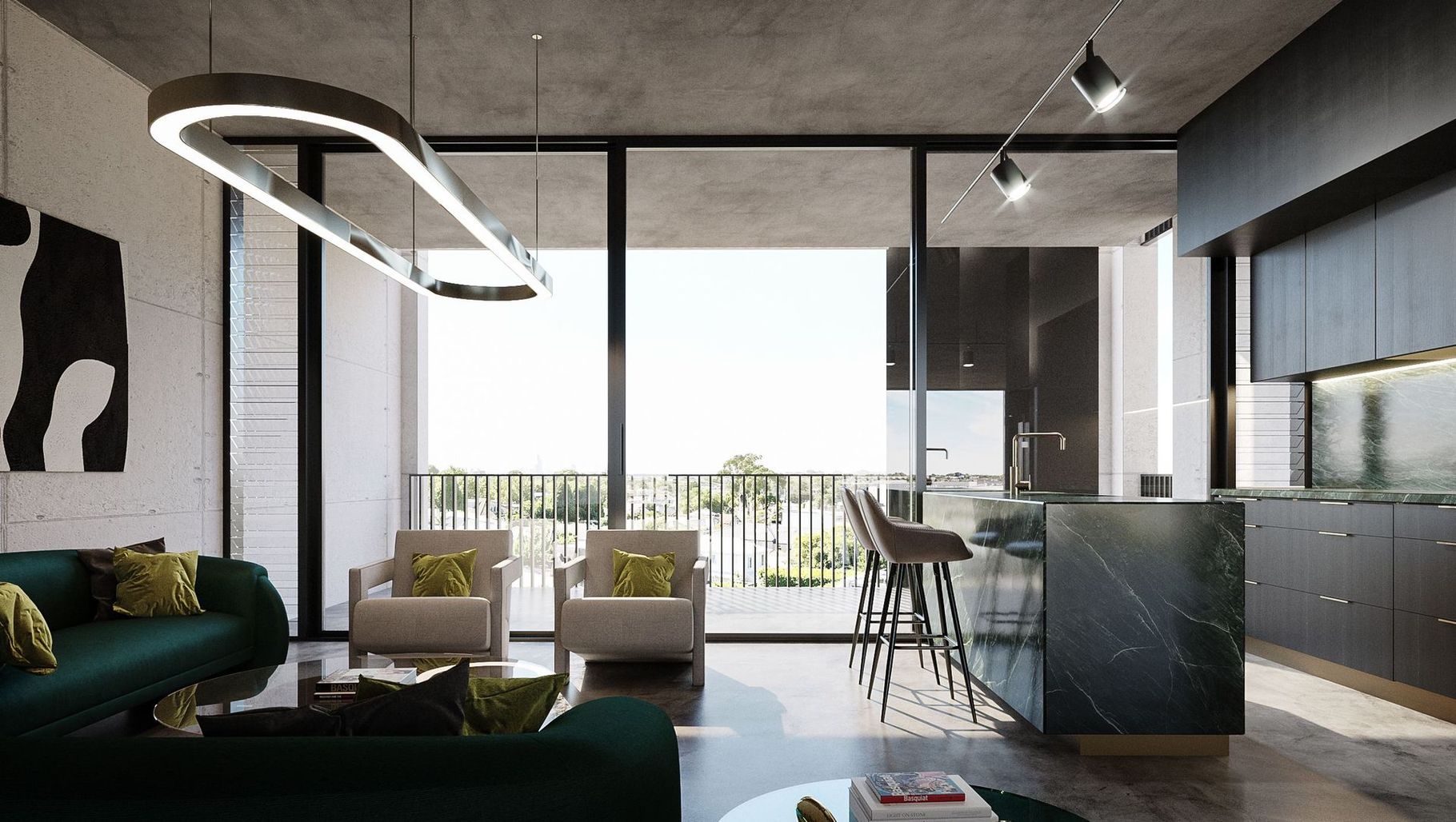ArchiPro Project Summary - Buscomb Studio showcases modern aesthetics with functional living, featuring elegant light fixtures and a stylish dining area.
