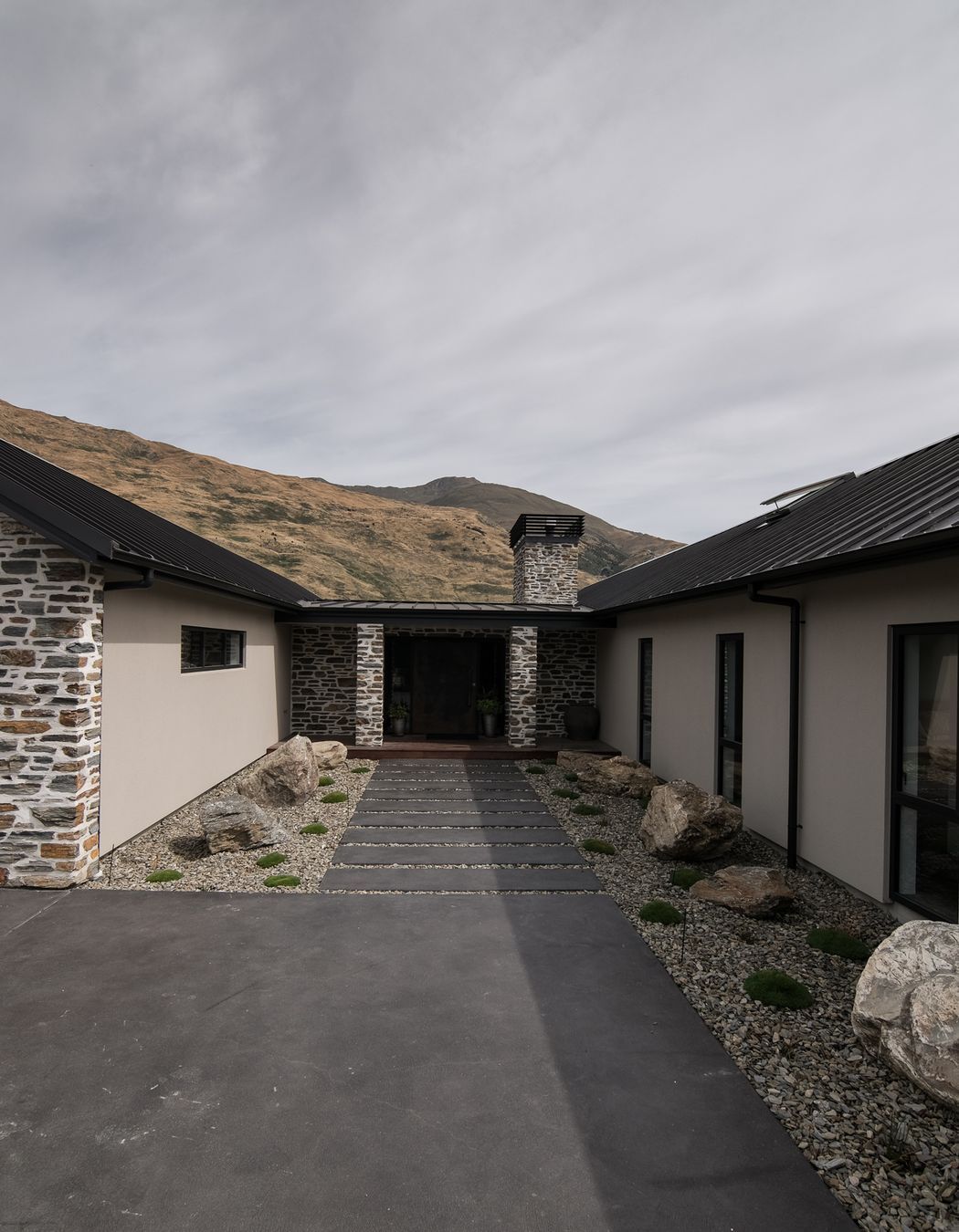 ArchiPro Project Summary - A beautifully designed single-storey family home with two-storey guest accommodation, seamlessly integrated into the Central Otago landscape, featuring a blend of plaster, schist, and tray tin cladding.