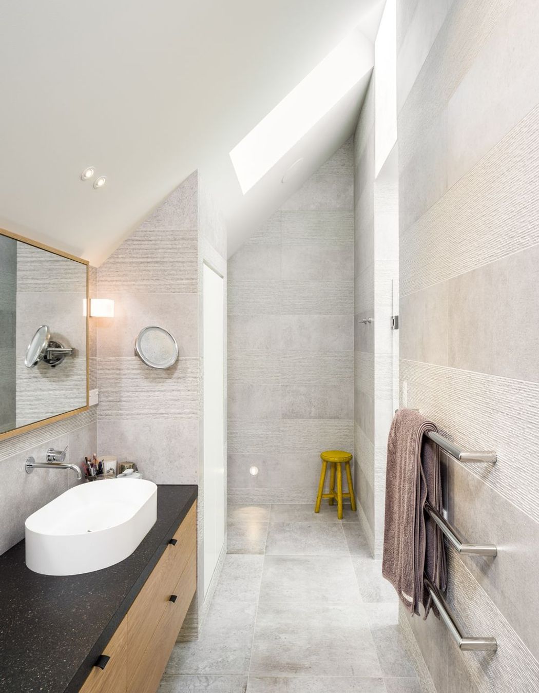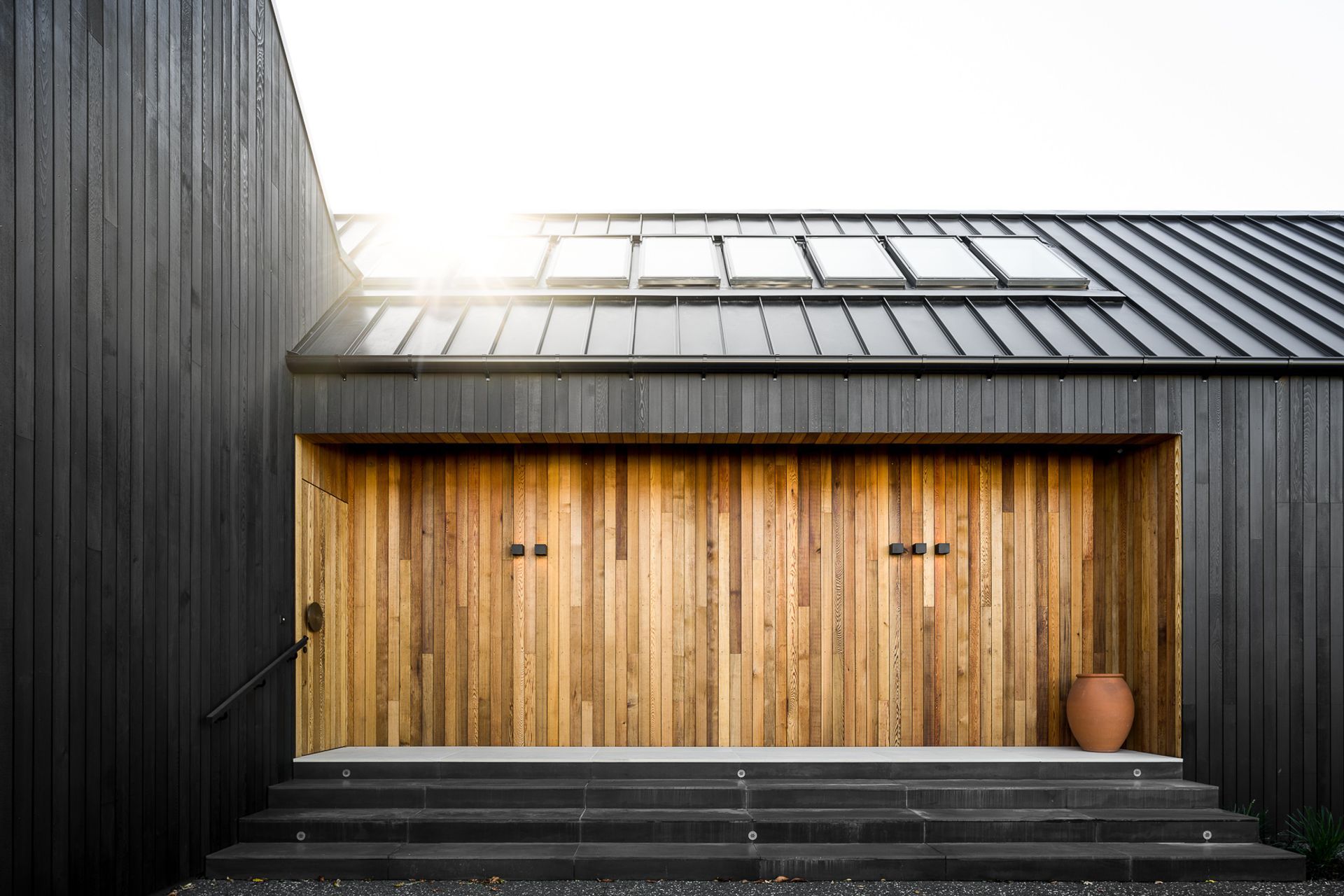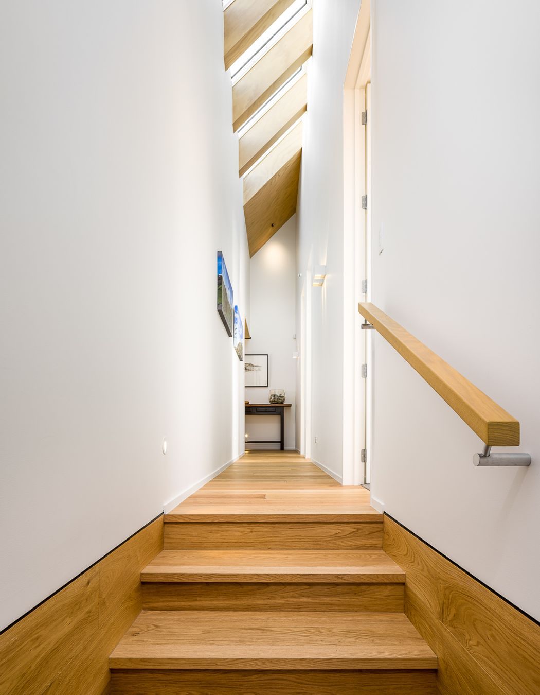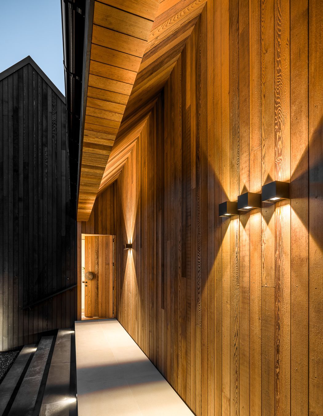 The long interior hallway that links through to the garage has been imbued with warmth and interest through the choice of oak flooring and the timber-wrapped beams located between the skylights. The corresponding front doorway and passage, where striking golden cedar glows against the home’s solid, almost impenetrable mass, quickly catches the eye.