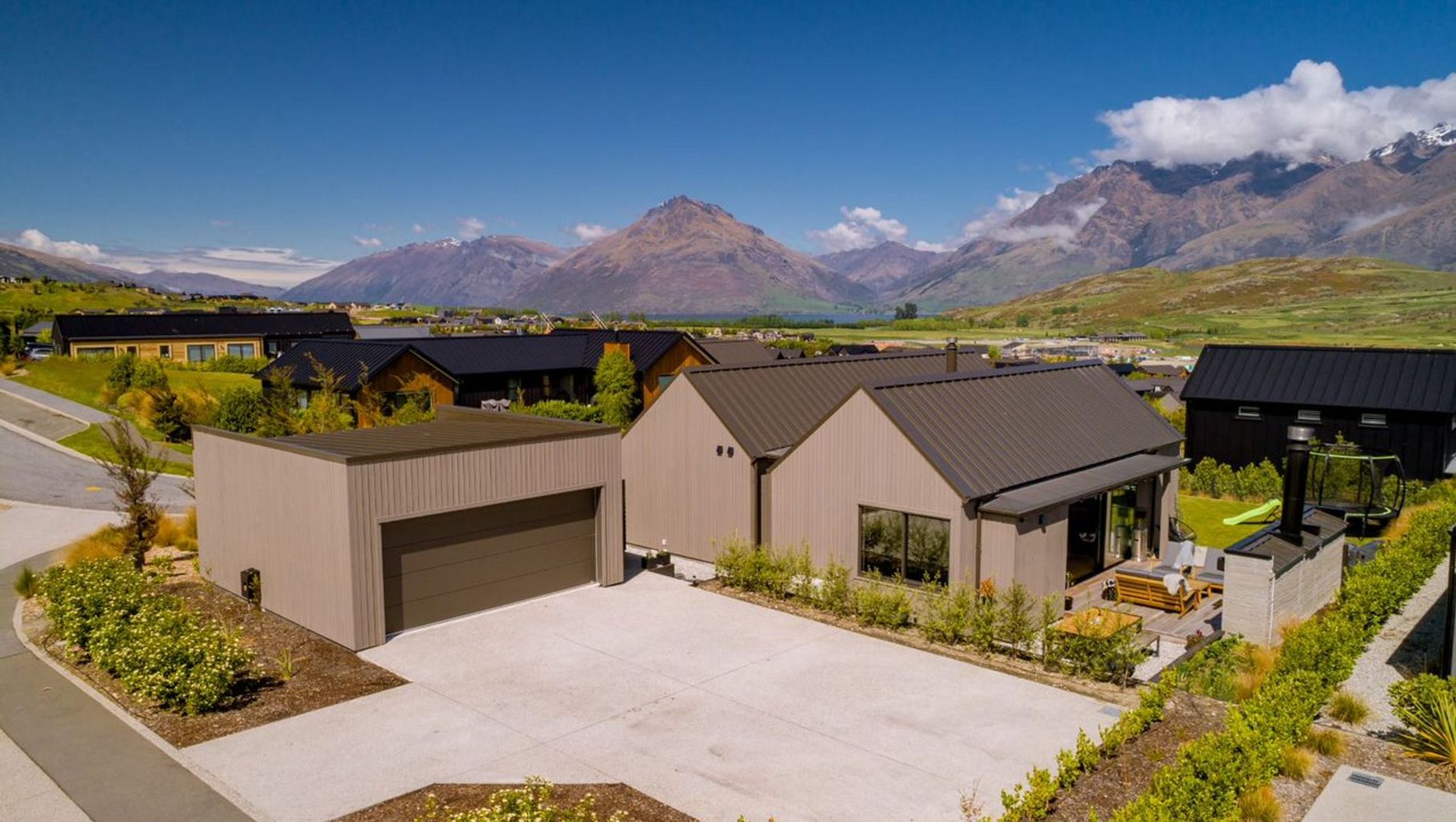 ArchiPro Project Summary - Stunning 3-bedroom home in Jacks Point featuring breathtaking views of Lake Wakatipu and the Remarkables, designed by Matz Architects with high-spec finishes, oak timber floors, cedar cladding, and an inviting outdoor entertaining area.