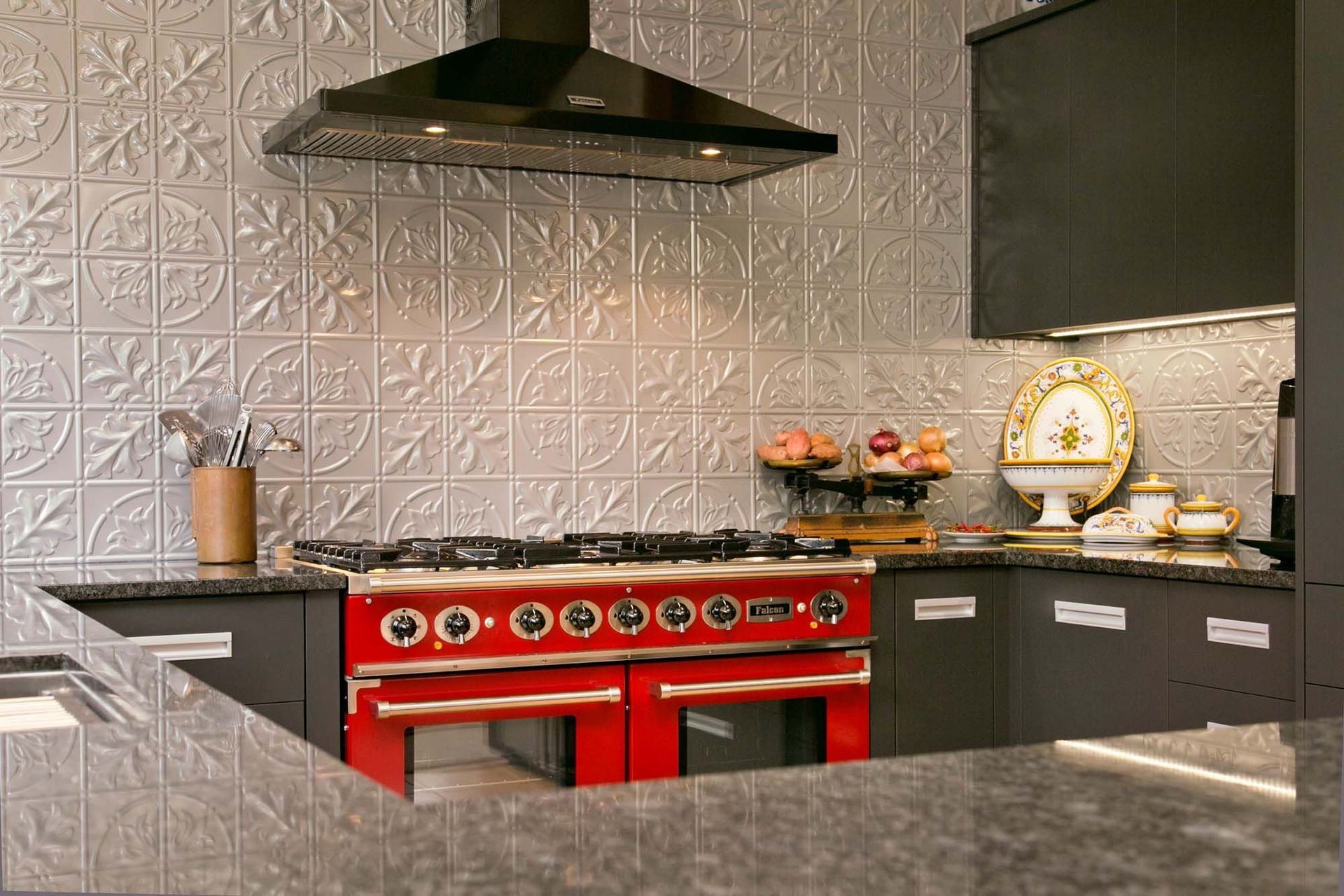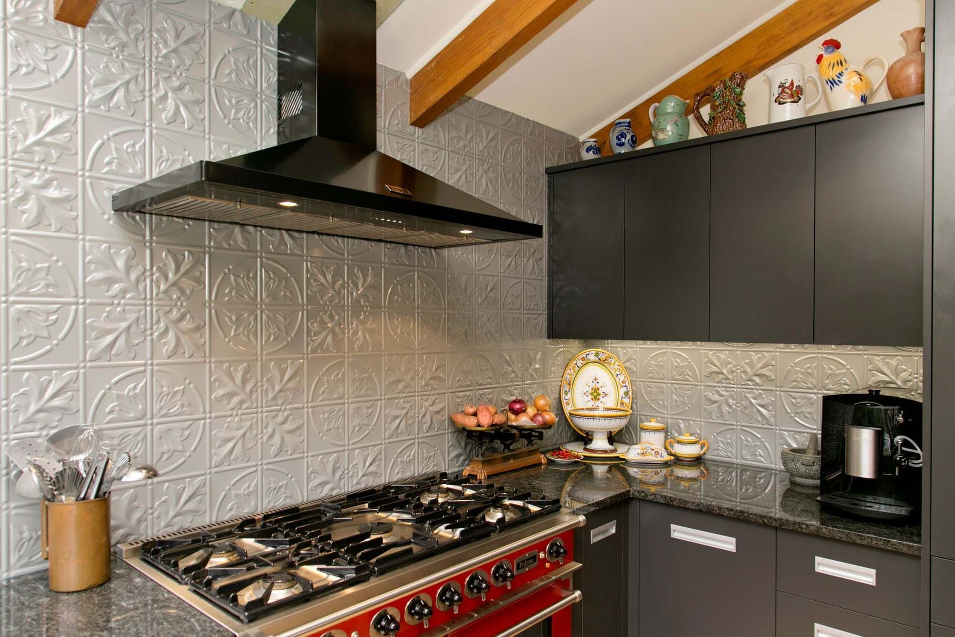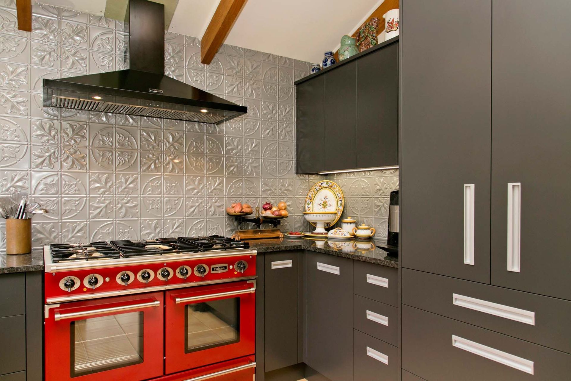 ArchiPro Project Summary - A culinary haven featuring a stunning red Falcon Freestanding oven, tailored storage solutions for herbs, spices, and appliances, and a striking powder-coated pressed tin splashback enhanced by LED lighting for optimal functionality.
