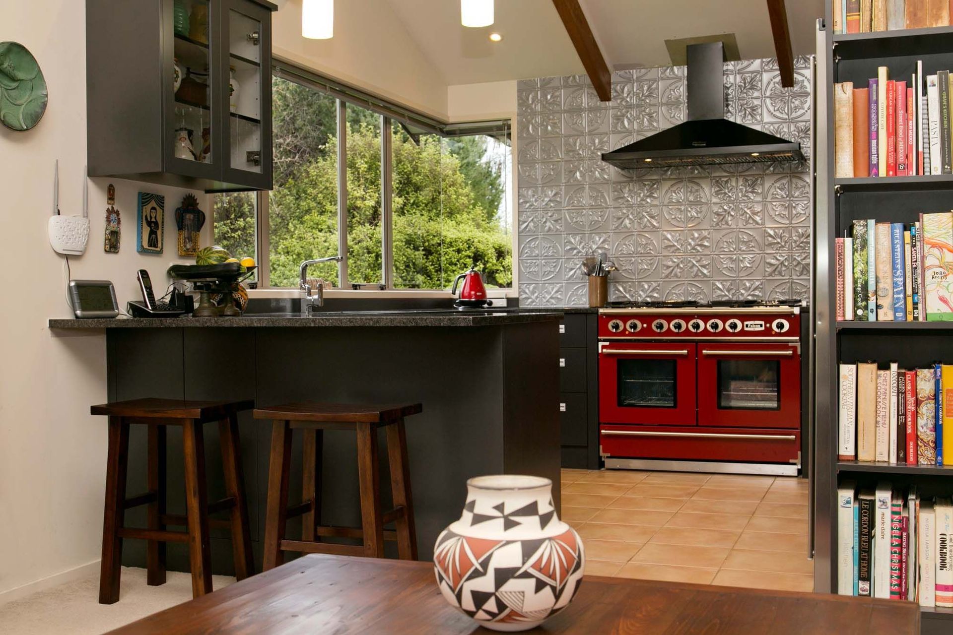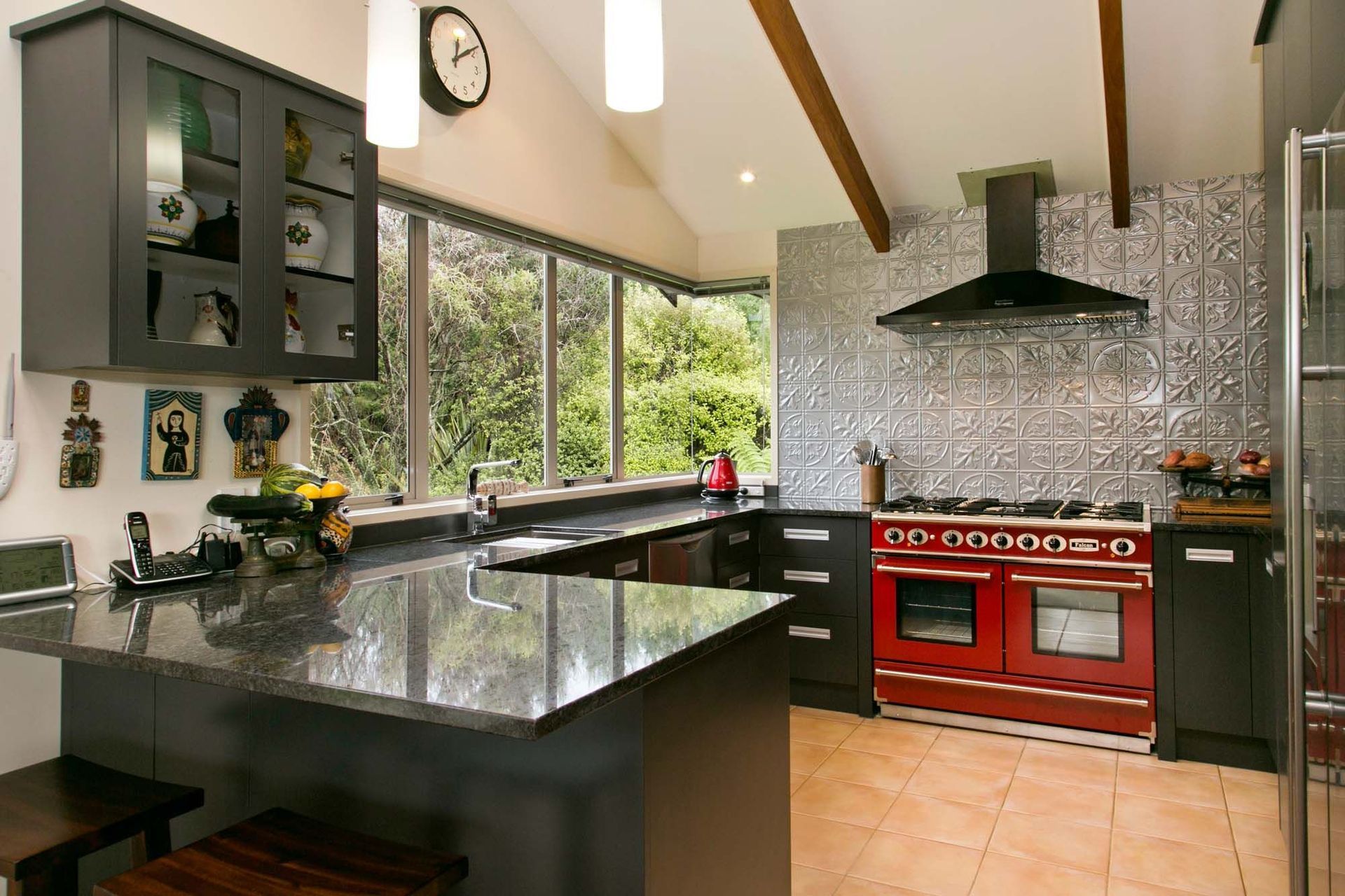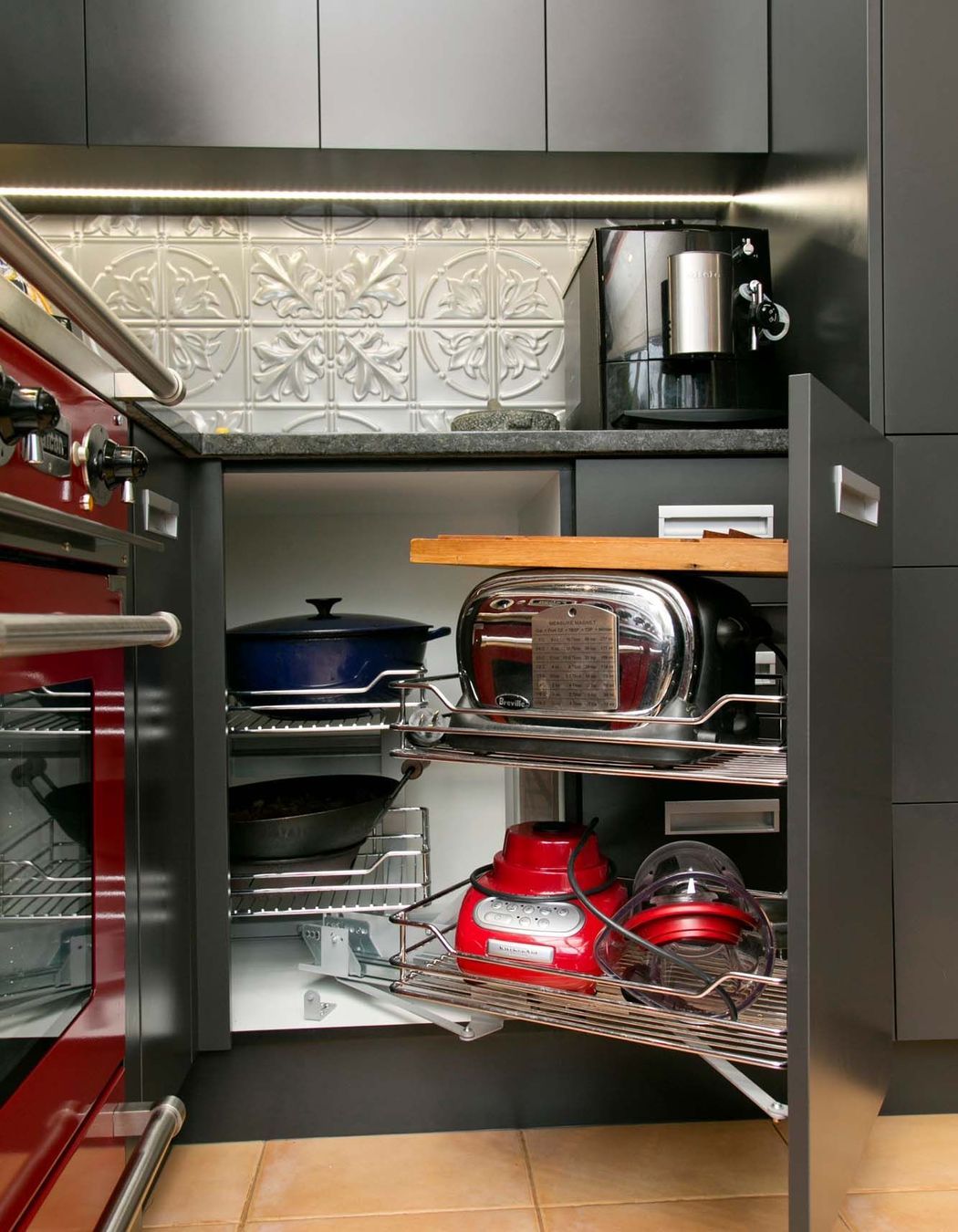ArchiPro Project Summary - A culinary haven featuring a stunning red Falcon Freestanding oven, tailored storage solutions for herbs, spices, and appliances, and a striking powder-coated pressed tin splashback enhanced by LED lighting for optimal functionality.
