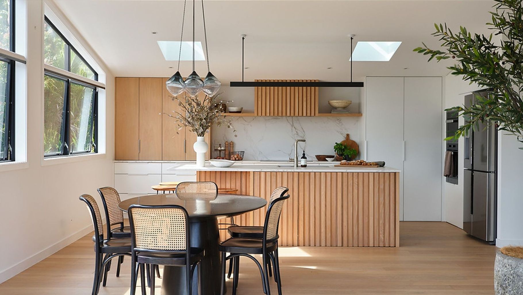 The southern wall of the kitchen is low, so the vertical battens and cabinetry design focuses on vertical lines to elongate and heighten this rear elevation. The wall ovens and fridge are positioned on the return wall of the kitchen enabling a calm considered view on entrance and from the lounge. The full length cupboards house Blum space towers for ample accessible storage. The left hand side of the kitchen is designed with the mornings in mind. Bench seating is designed at the end of the island to capitalise on the morning sun and the 'on bench' pantry houses the toaster and everyday appliances which once closed hide the mess of day to day life. The width of the island allows for storage on the reverse side, housing items for the dining table amongst other things. The island bench and splash-back are Dekton by Constentino, offering a beautiful focal point for the kitchen and splash-back whilst being hardwearing and easy to clean. The base tone is warm and the colours sympathetic to the interior.