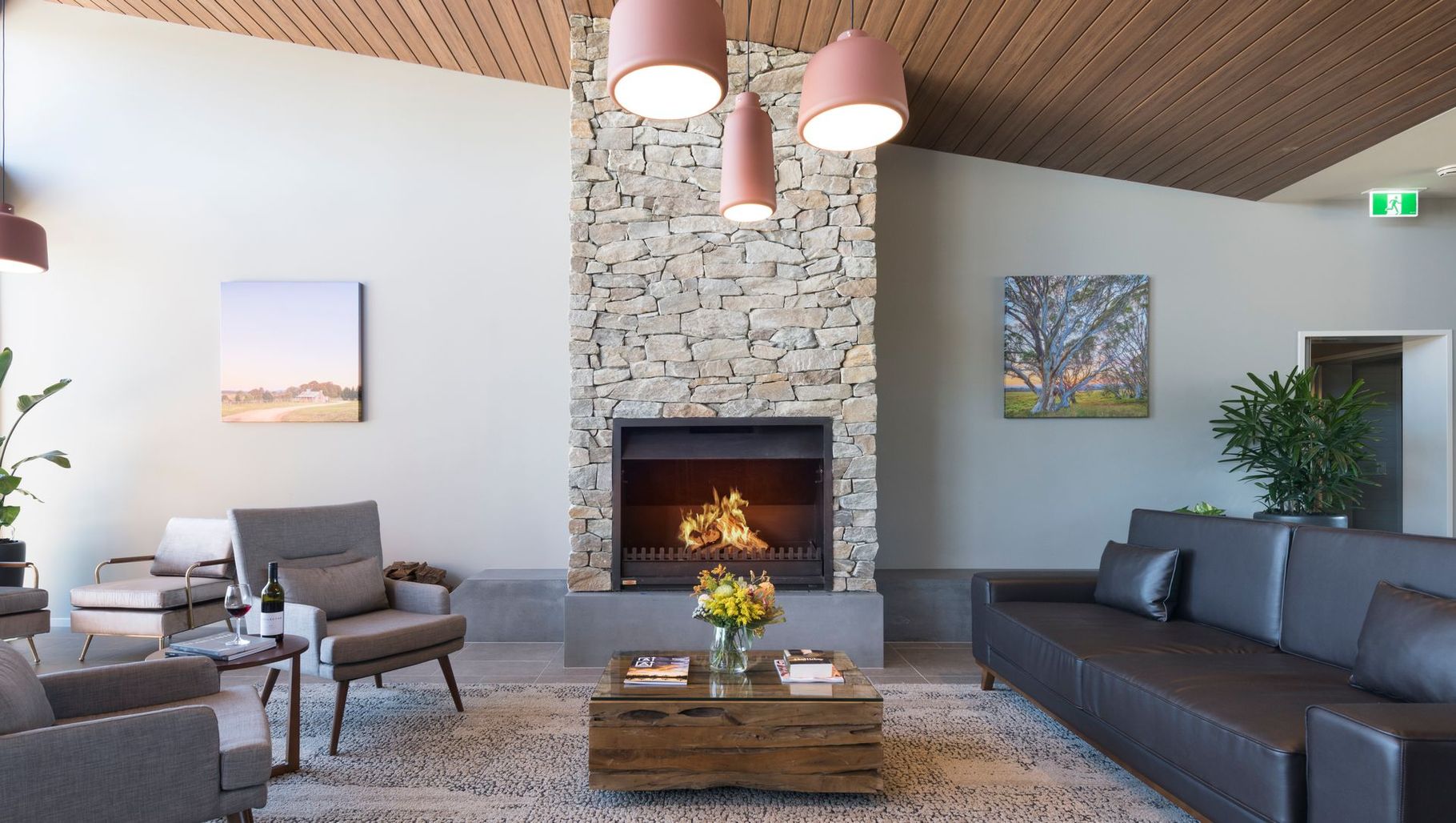 ArchiPro Project Summary - Luxurious hotel design in the Australian Alps, featuring contemporary interiors with high-end joinery, soft finishes, and a stunning alpine stone fireplace, creating a sophisticated and comfortable space for guests to enjoy breathtaking views.