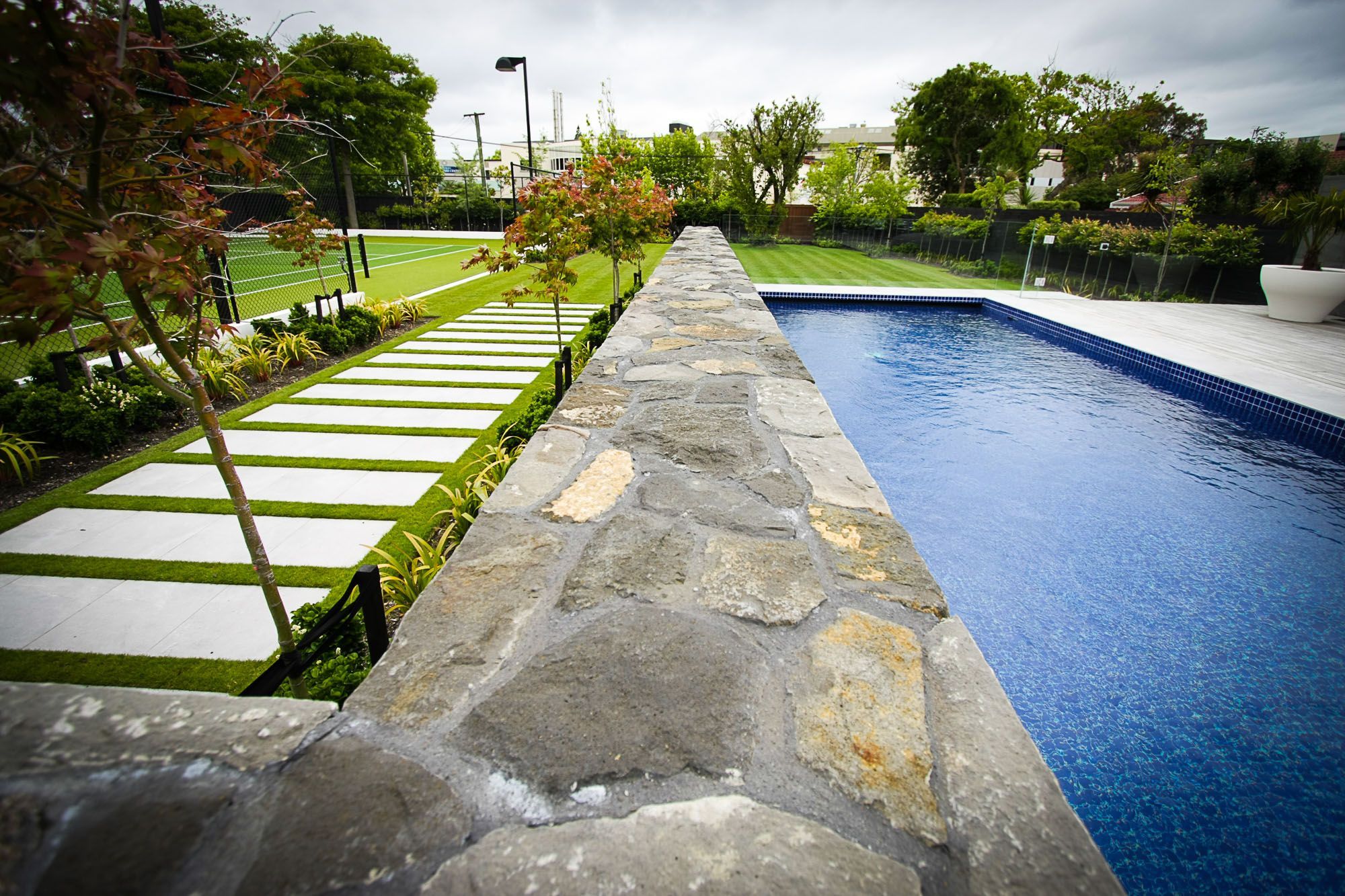 ArchiPro Project Summary - A stunning residential landscaping project in Merivale featuring clean lines, bold structural elements, and a functional outdoor entertaining area with an in-ground pool, full tennis court, and outdoor kitchen, all harmoniously integrated with established trees and locally sourced materials.