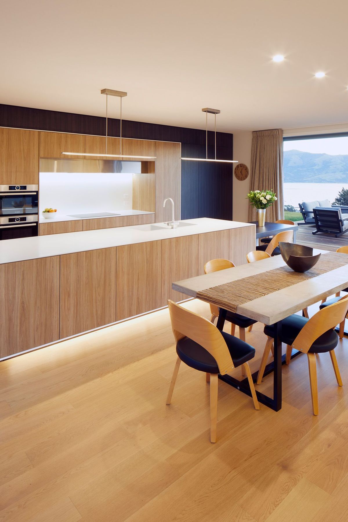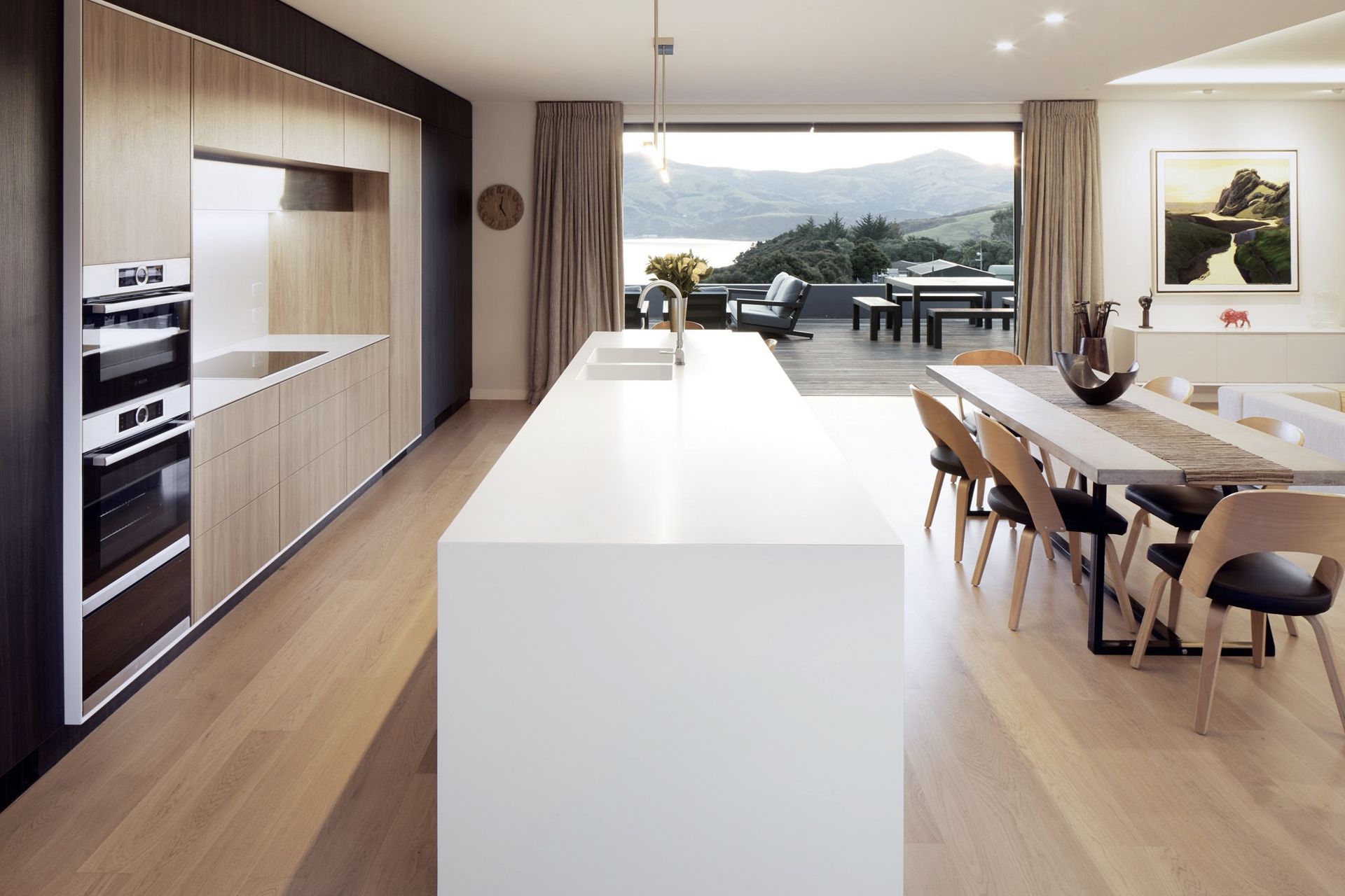 ArchiPro Project Summary - A sophisticated kitchen featuring handle-less design, seamless Corian finishes, and innovative storage solutions, perfectly complementing a modern home with stunning views.