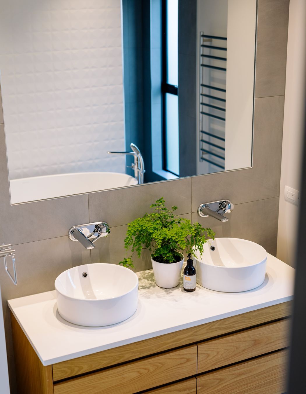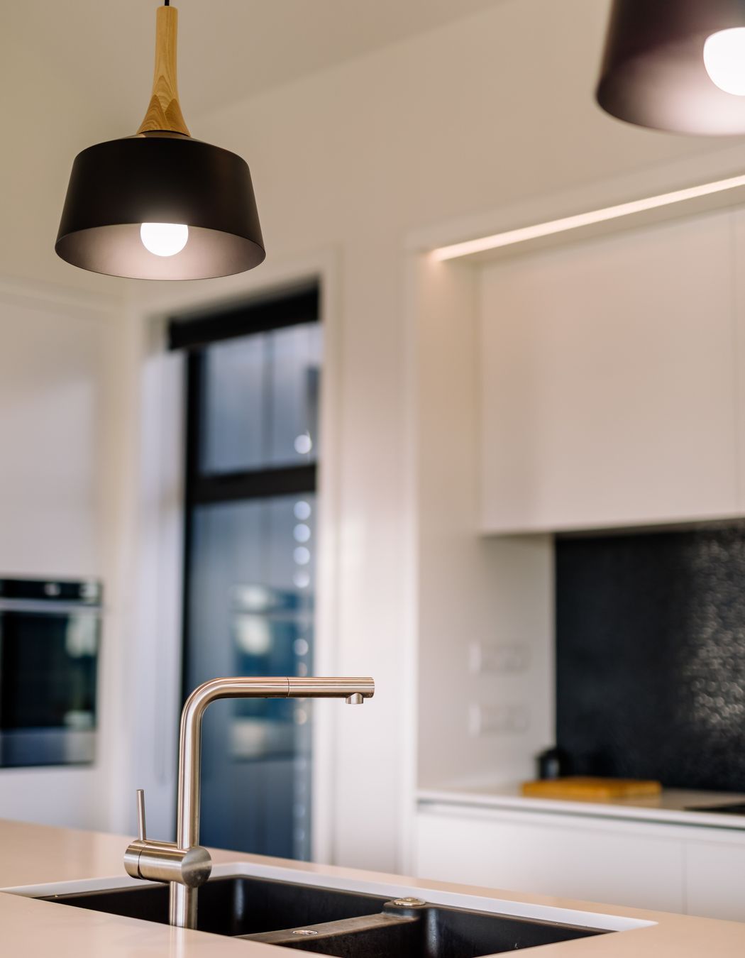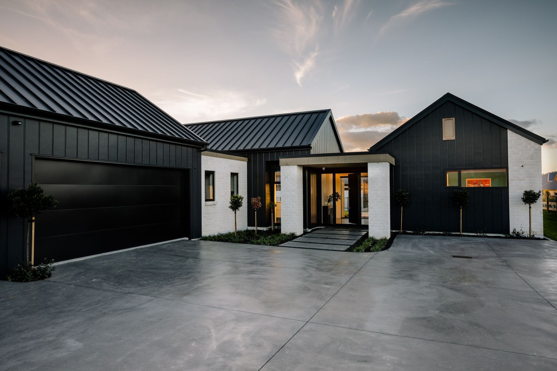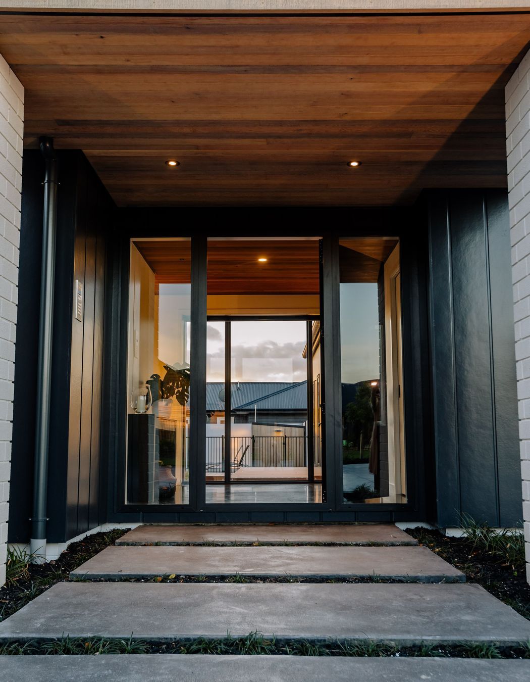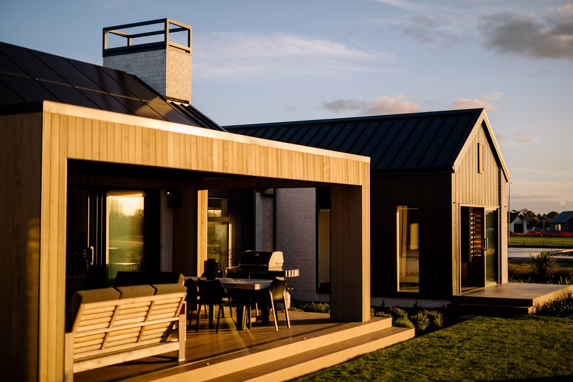 ArchiPro Project Summary - A sophisticated family home featuring a contemporary twist on traditional roof forms, complemented by a modern color and material palette, and infused with warm timber detailing for a fresh Scandi vibe.