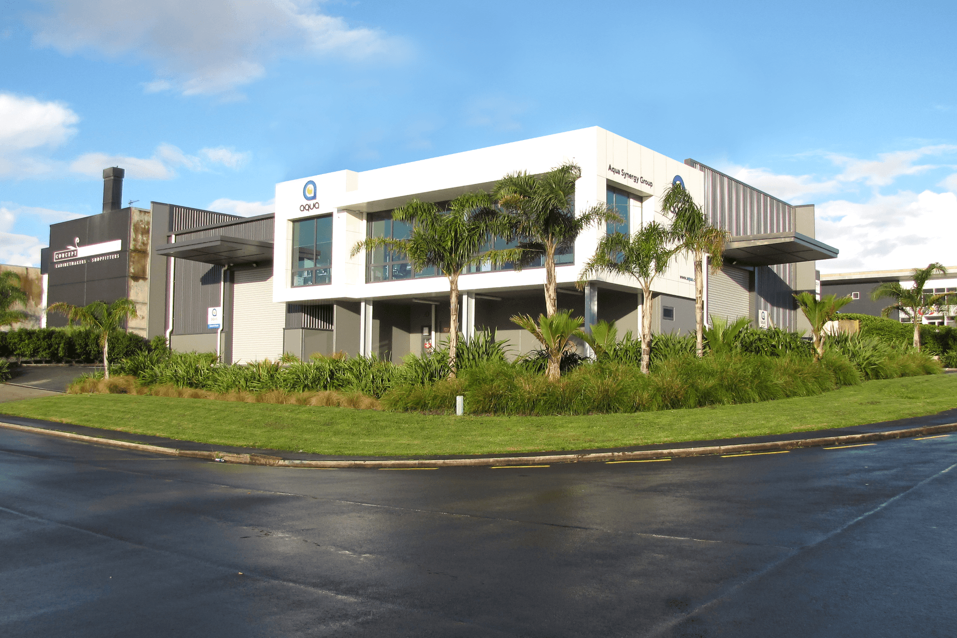 ArchiPro Project Summary - A strategically designed office-warehouse facility featuring dual roller door access, open plan triple-height storage, light-filled offices, and convenient sheltered parking, optimized for large vehicle maneuverability and future adaptability.