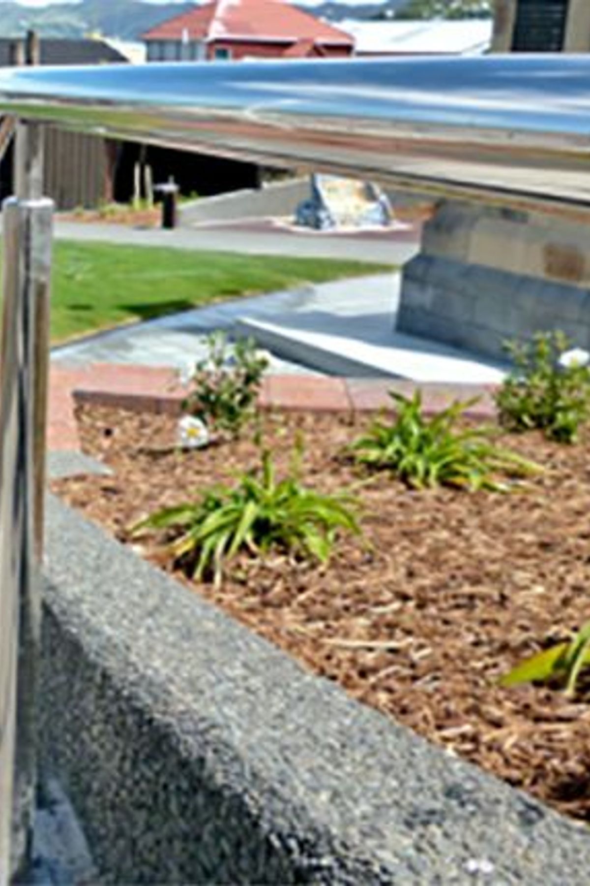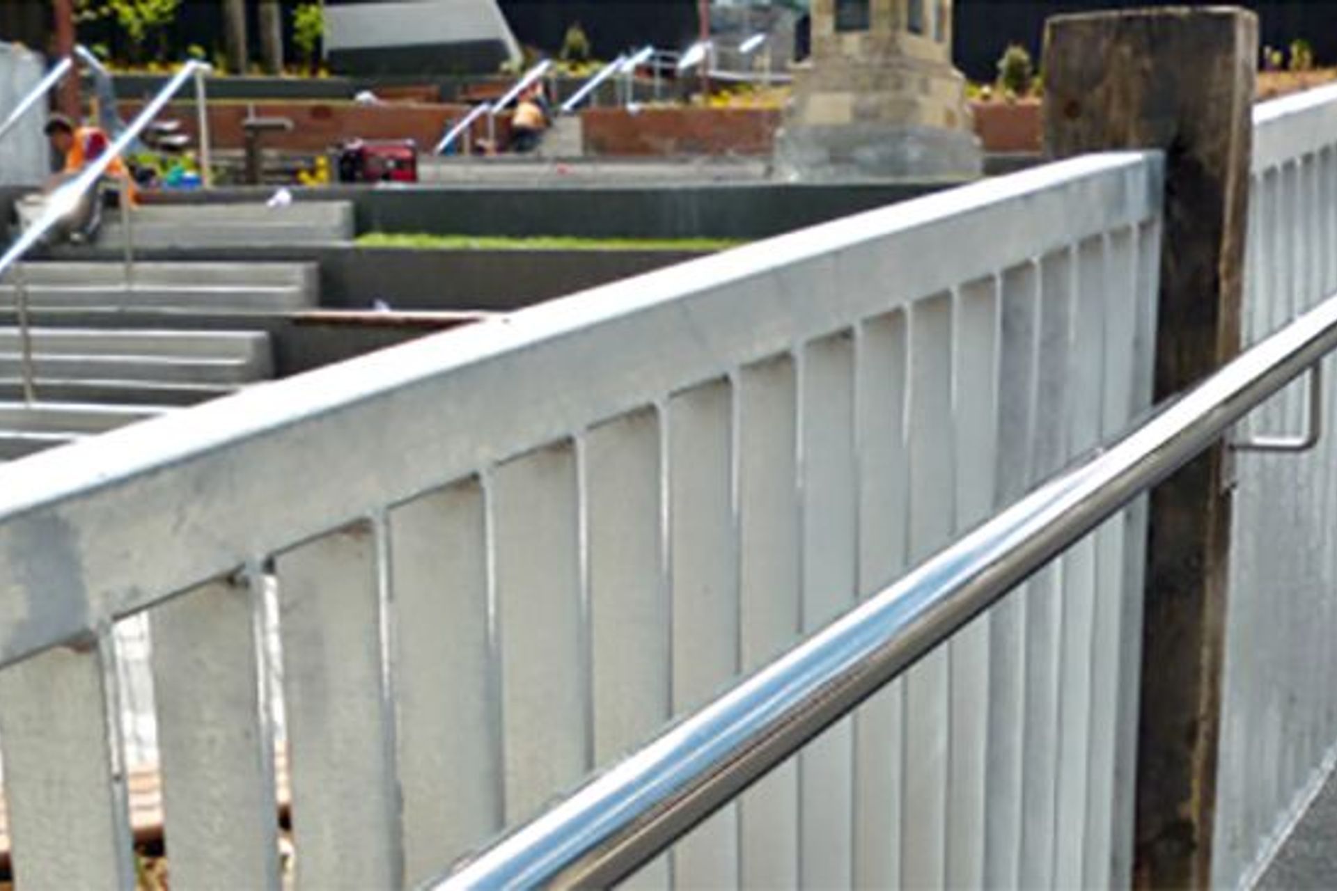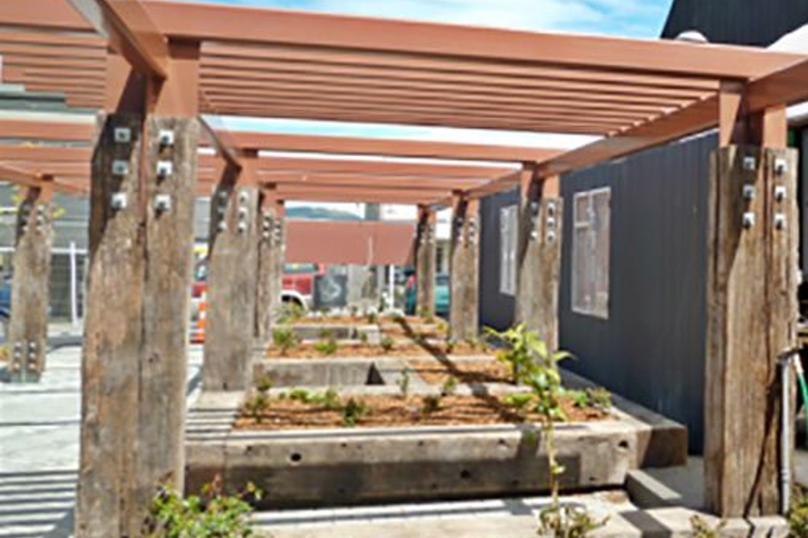 ArchiPro Project Summary - A community-focused Civic Square in Lyttelton featuring precision steelwork elements, including a Koru water feature, overhead structures, and elegant handrails, showcasing ENI Engineering Ltd's commitment to quality and aesthetic enhancement.