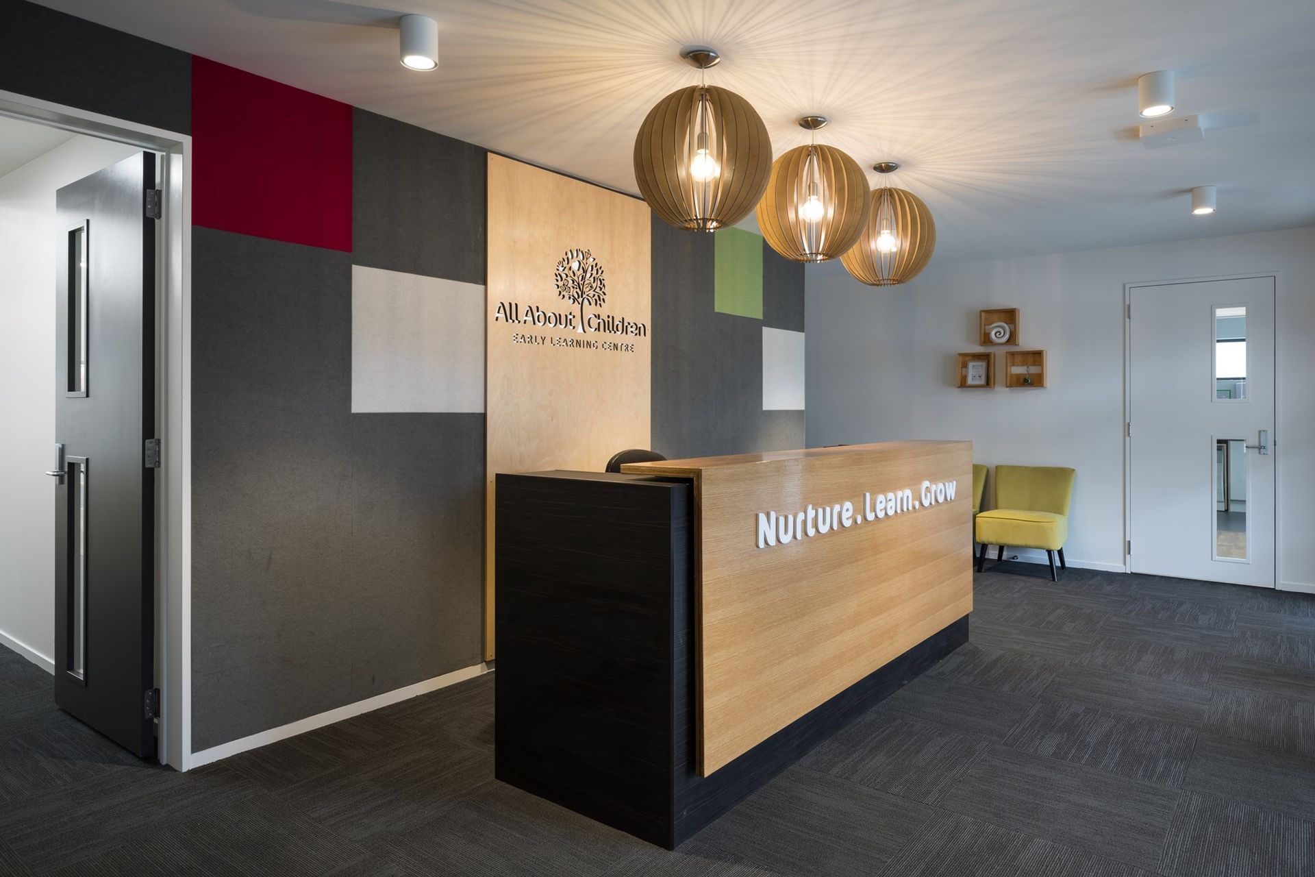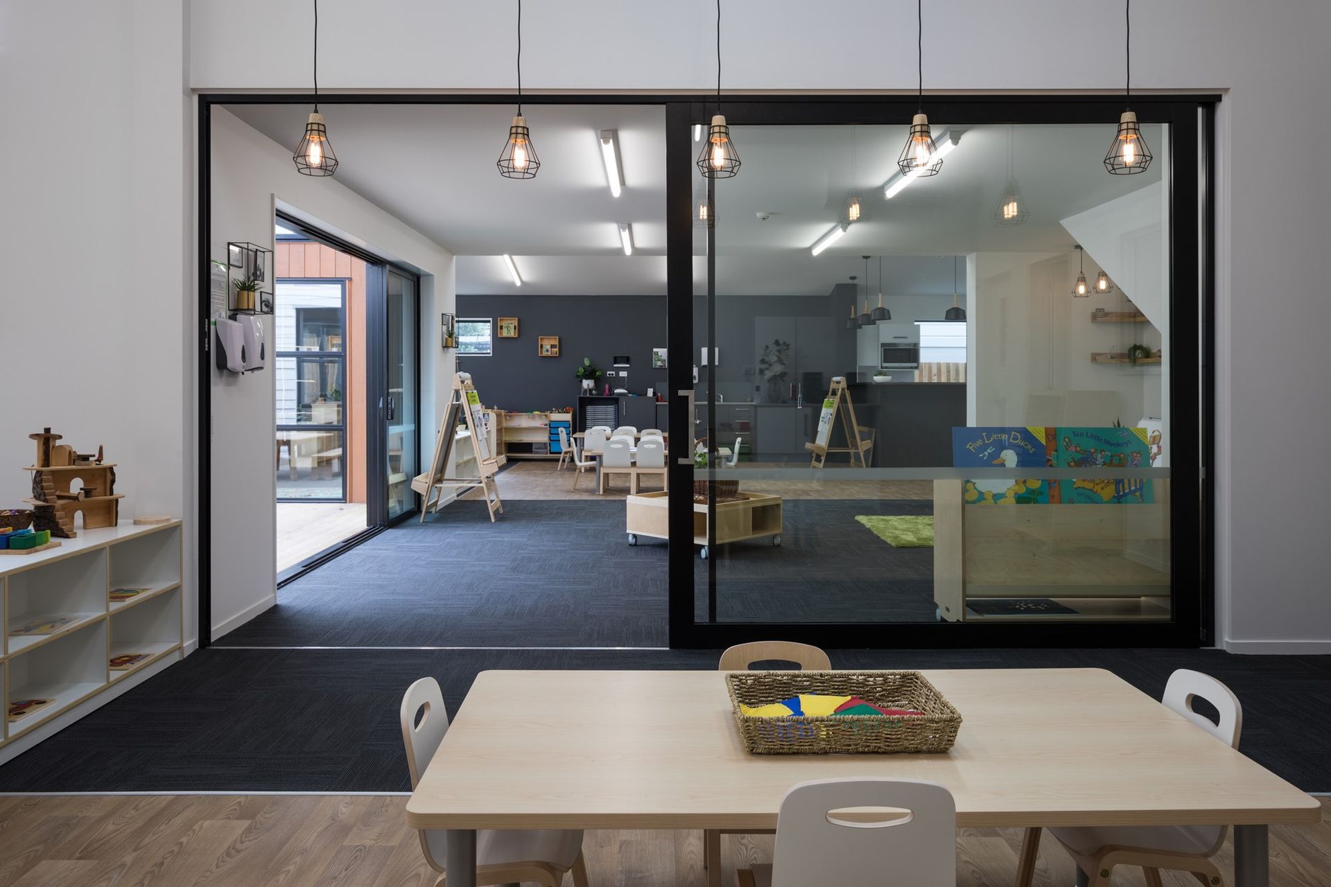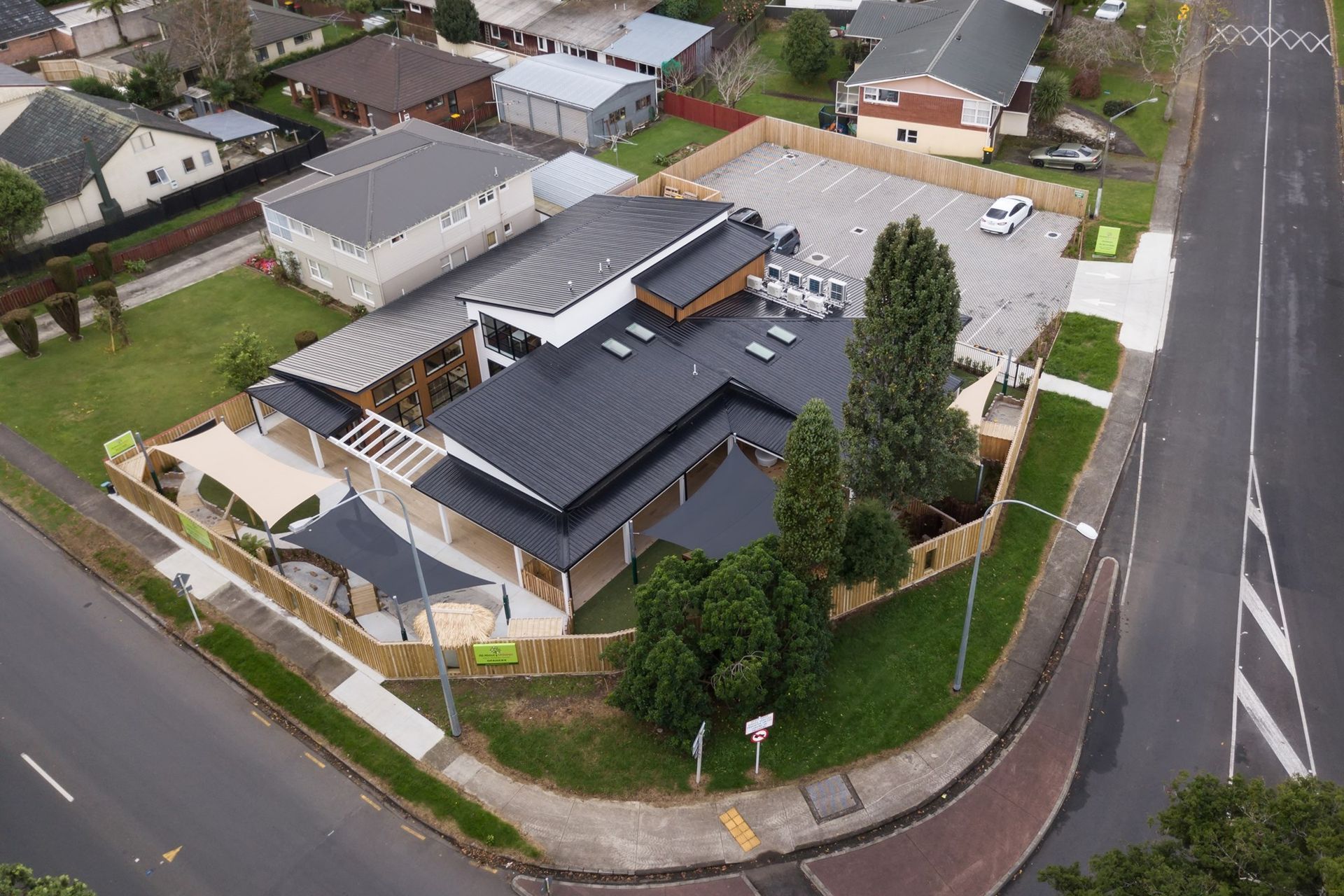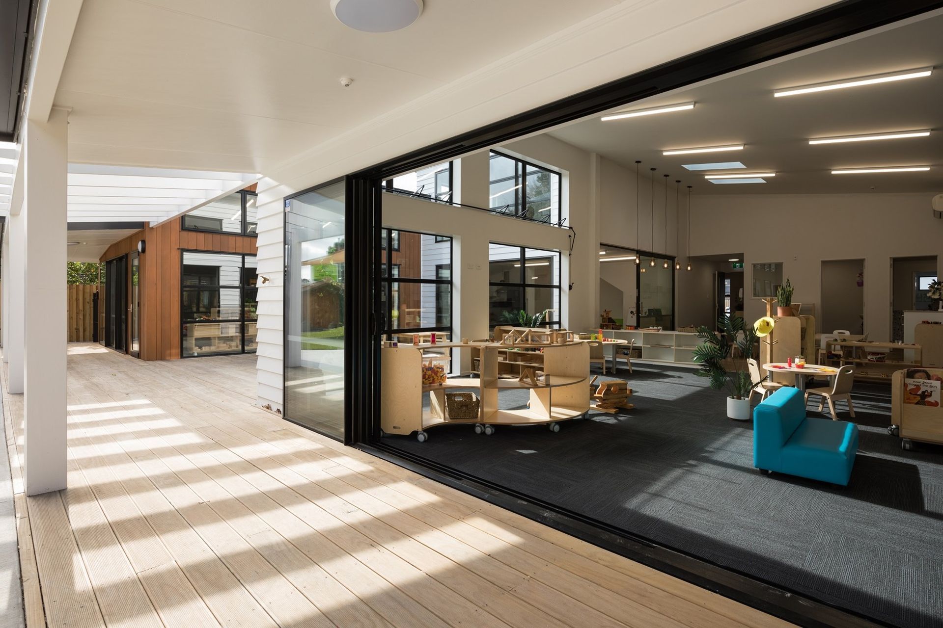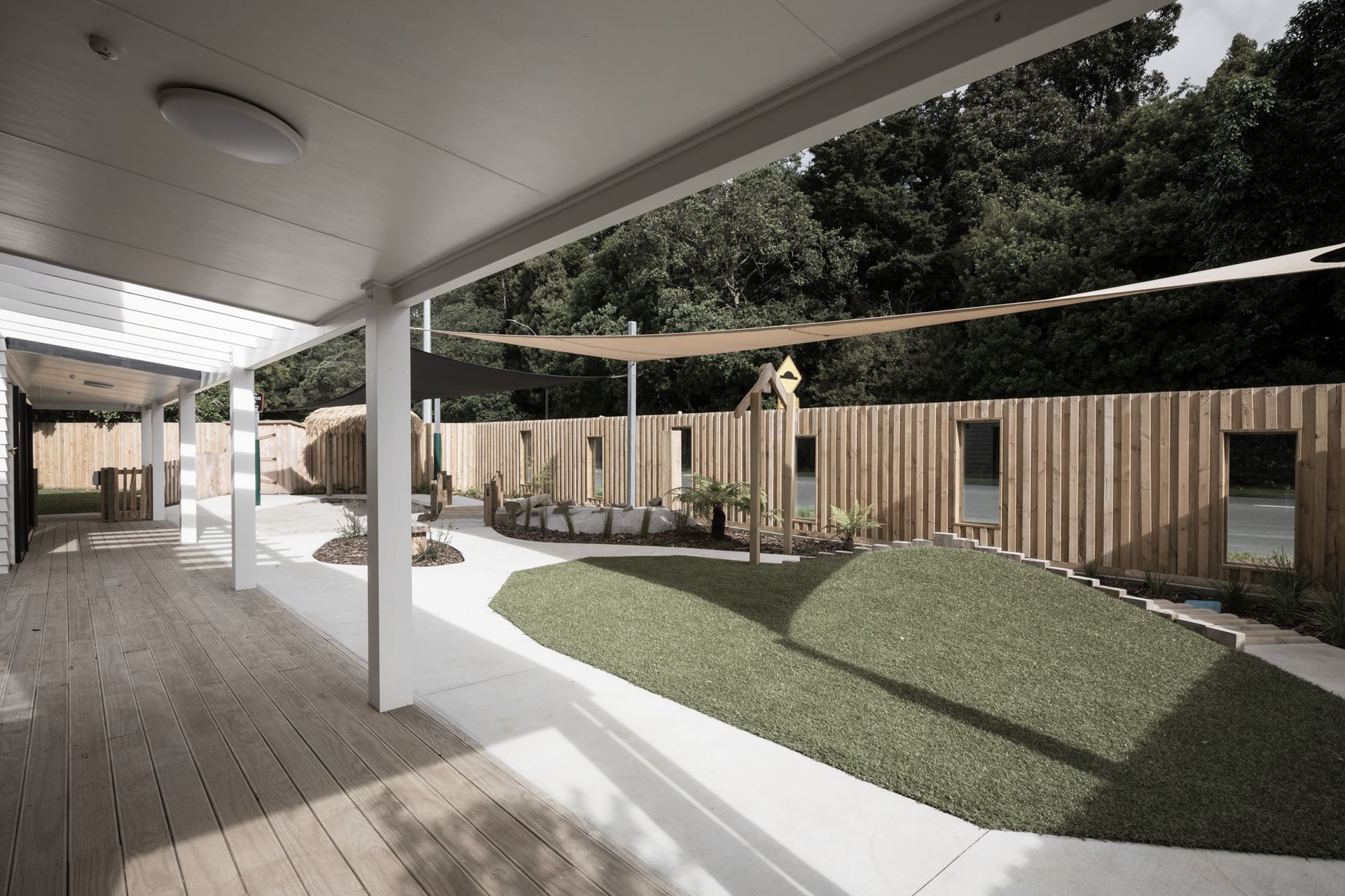ArchiPro Project Summary - A modern childcare centre in Papakura designed for 85 children, featuring natural exterior play areas and quality interior furnishings by Grocare, offering multiple play spaces and quiet rooms for a nurturing environment.