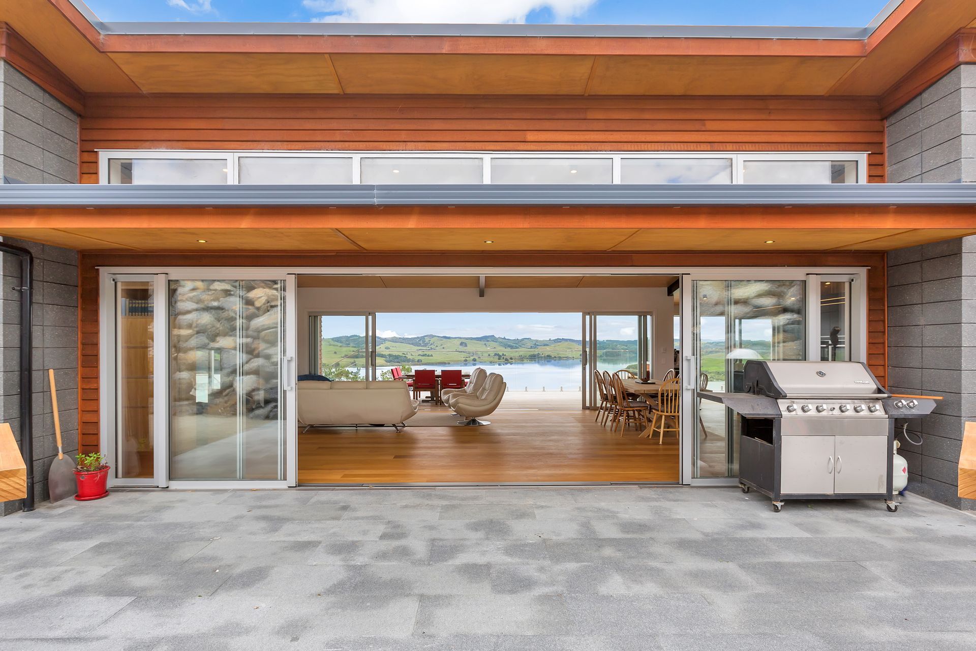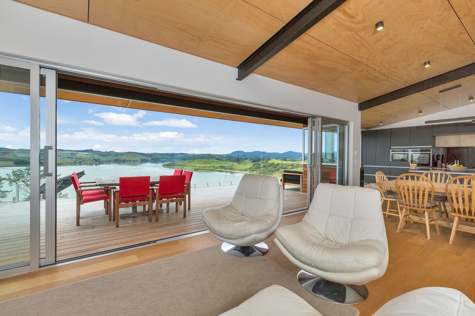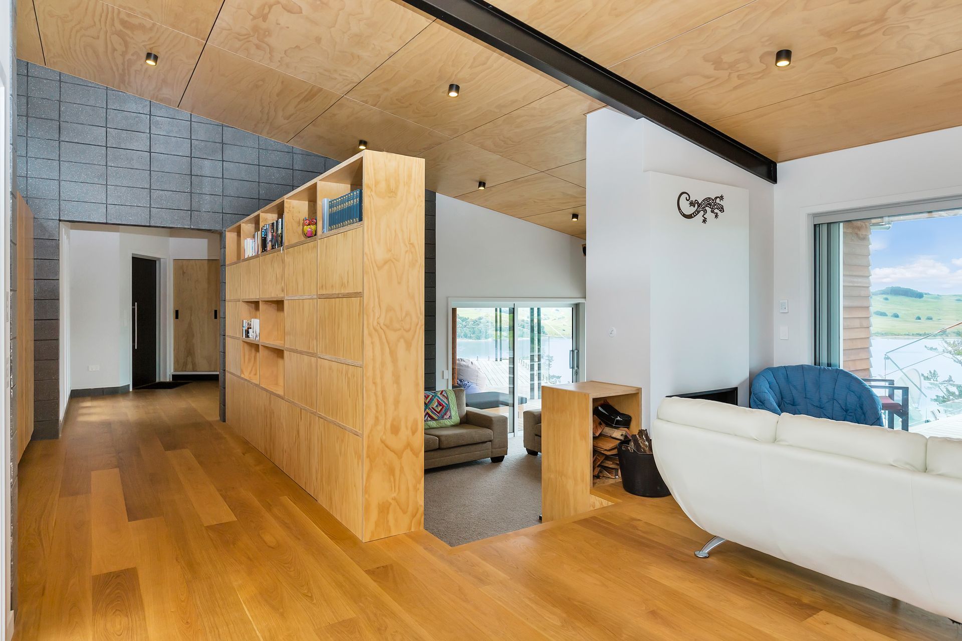 ArchiPro Project Summary - Elegant family residence on Kaipara Harbour featuring Formance SIP panels, cedar cladding, and oak timber flooring, designed with distinct wings for parents and children, centered around a communal living space.