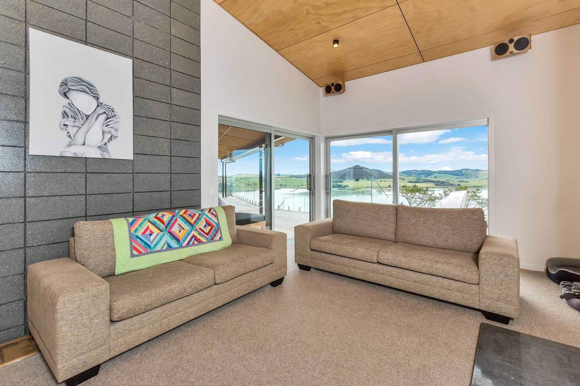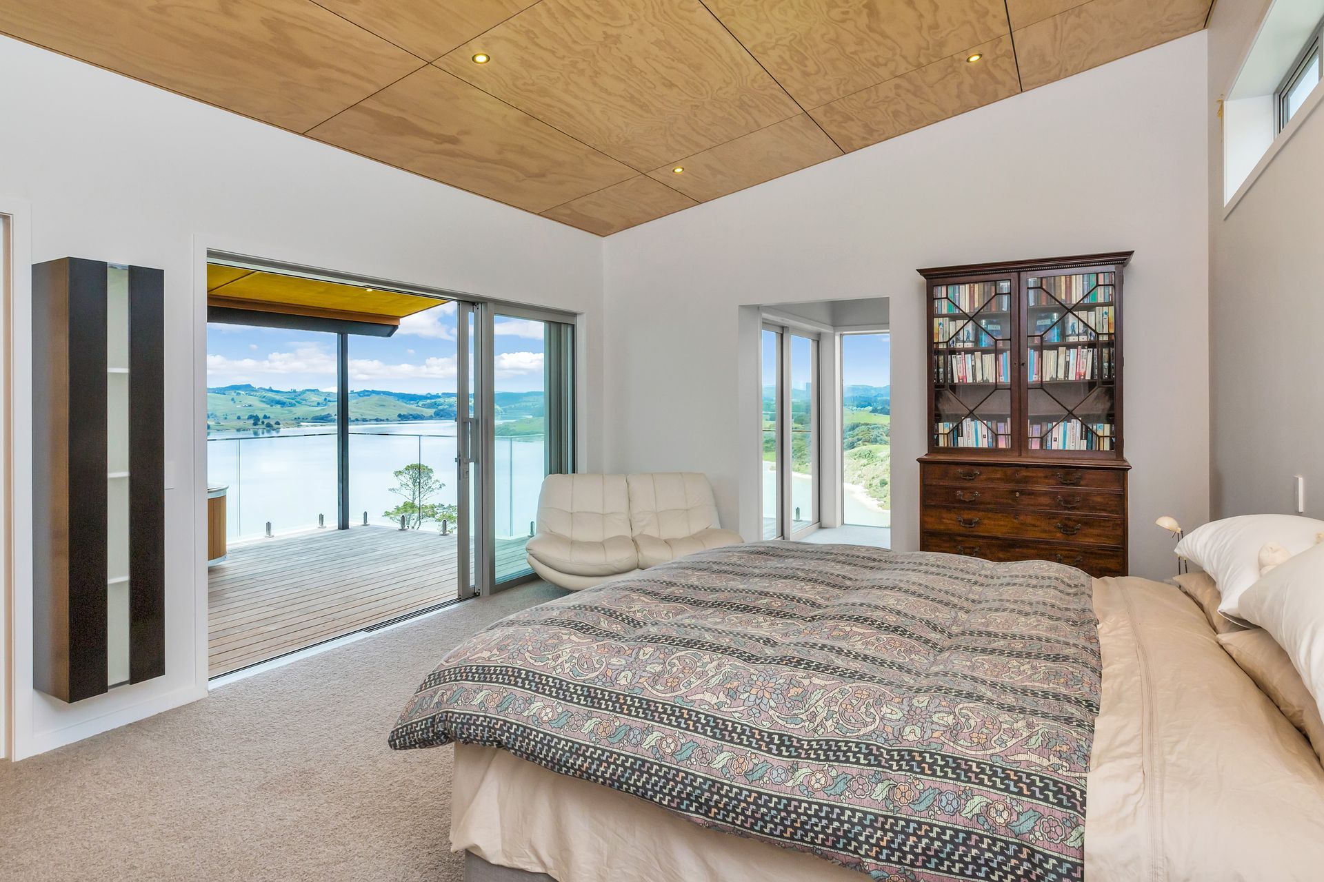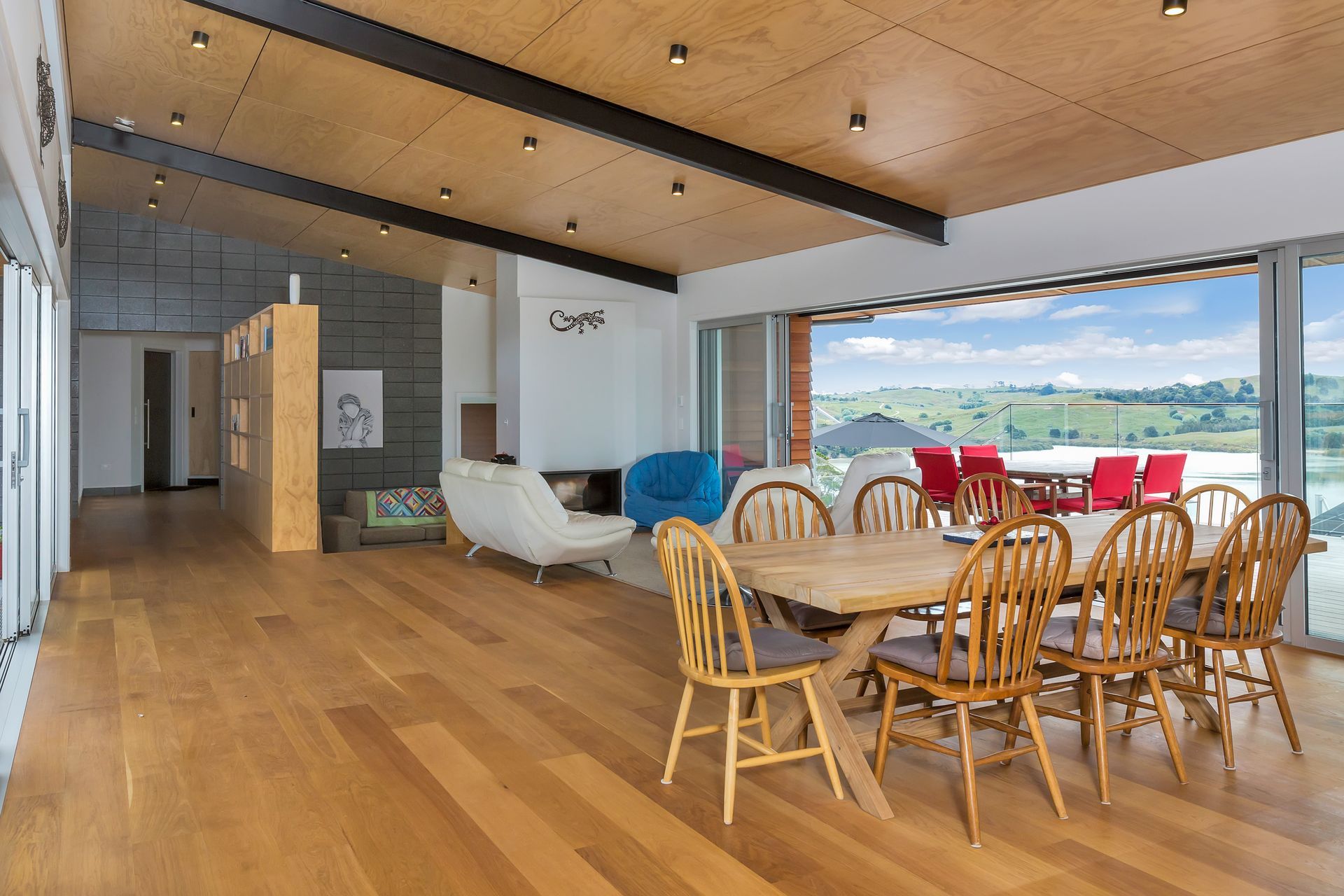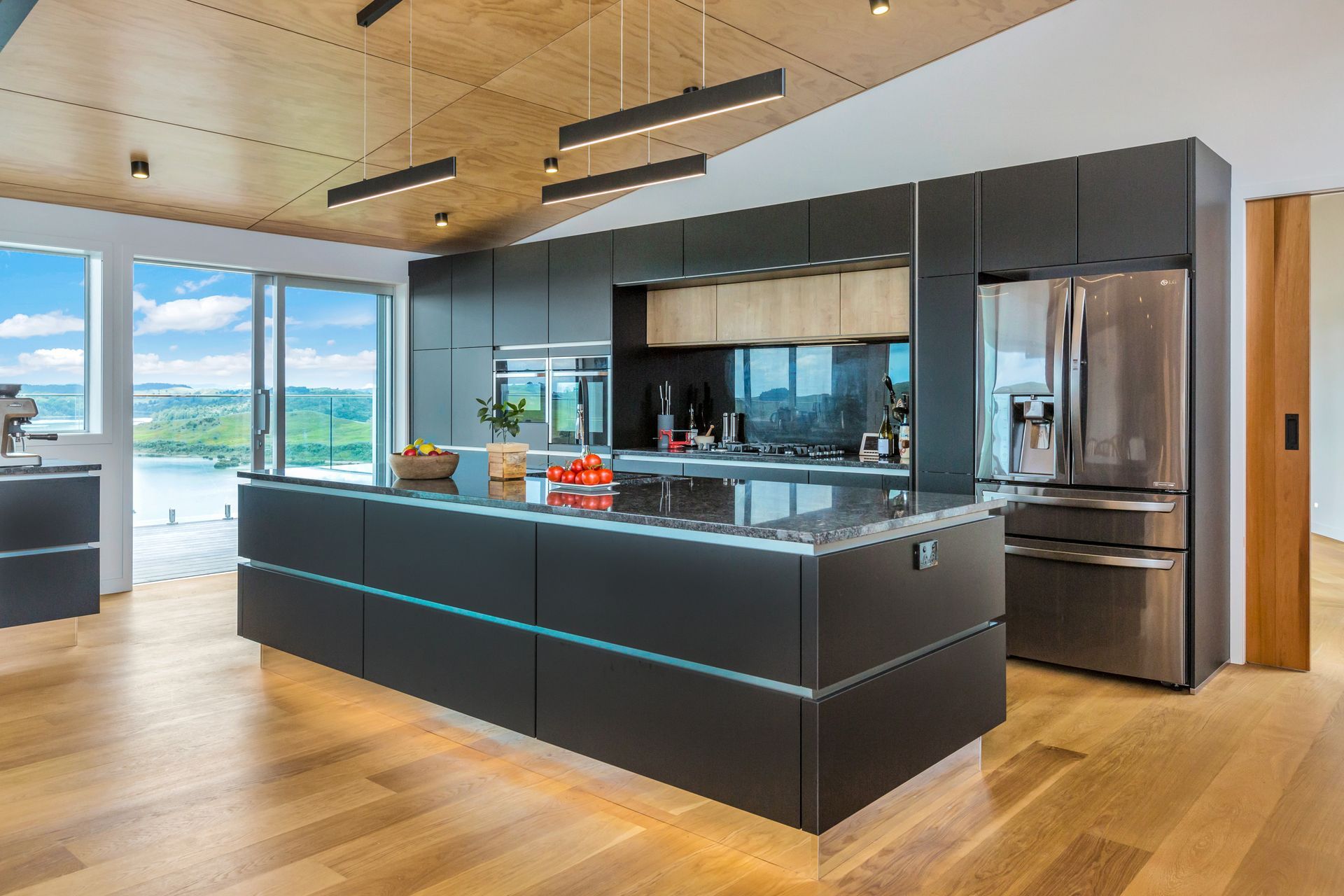 ArchiPro Project Summary - Elegant family residence on Kaipara Harbour featuring Formance SIP panels, cedar cladding, and oak timber flooring, designed with distinct wings for parents and children, centered around a communal living space.