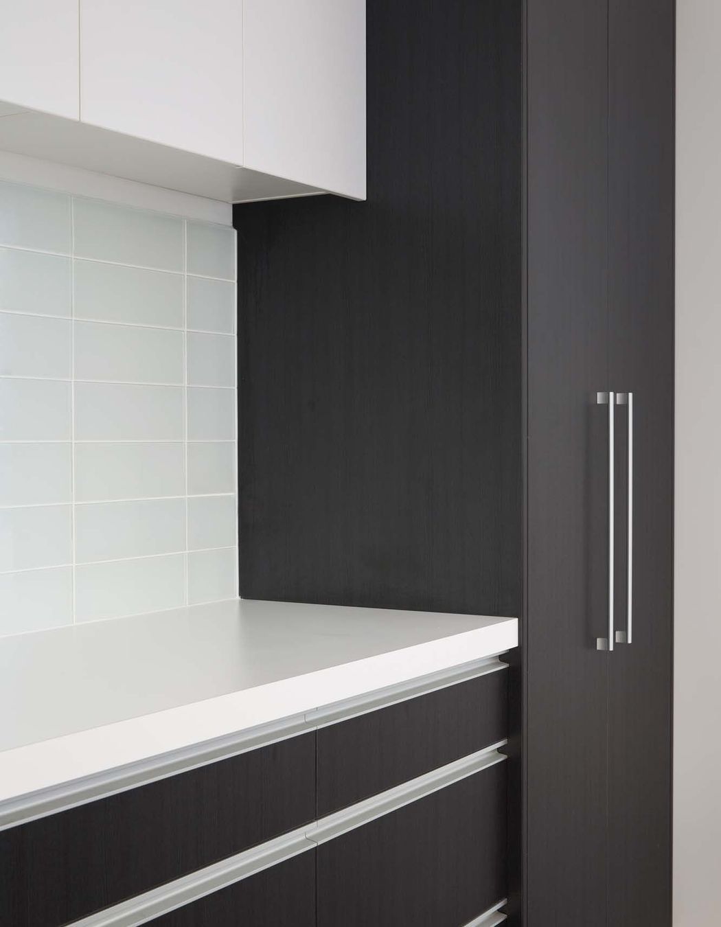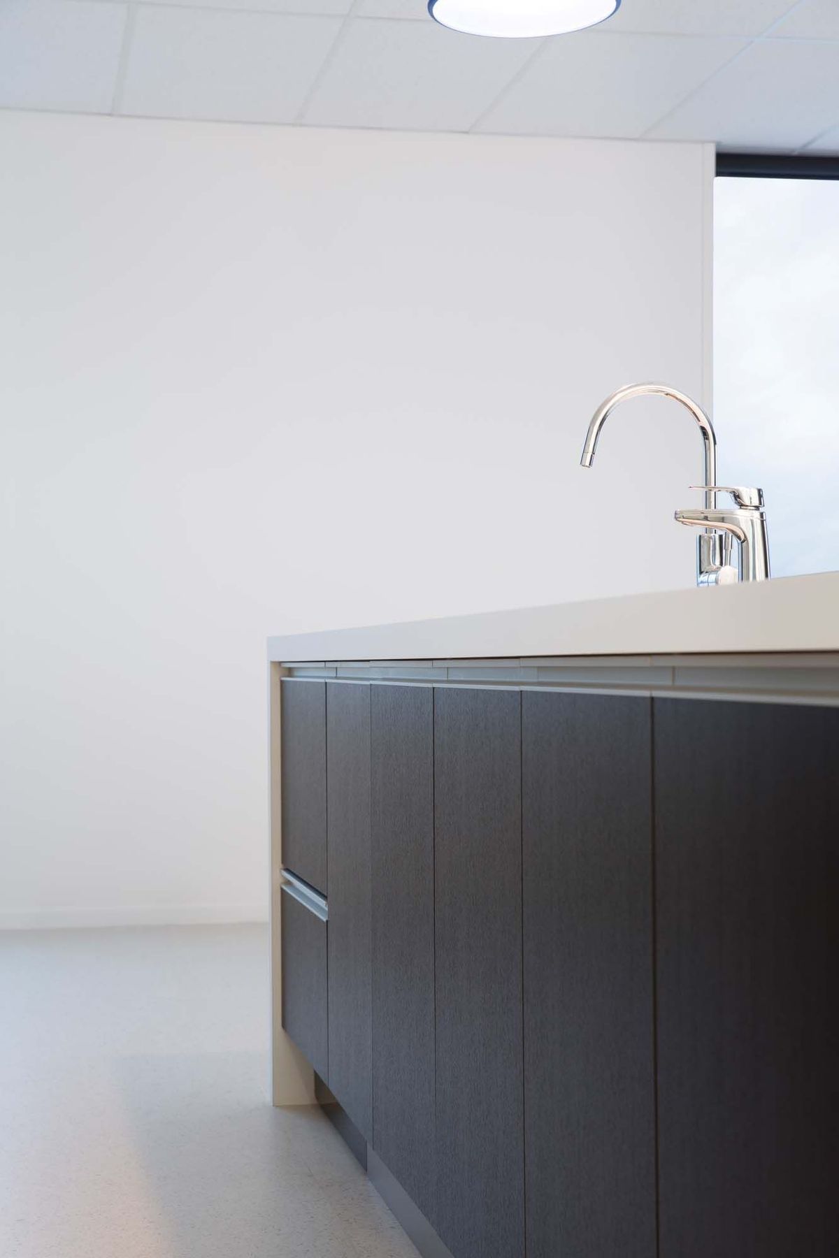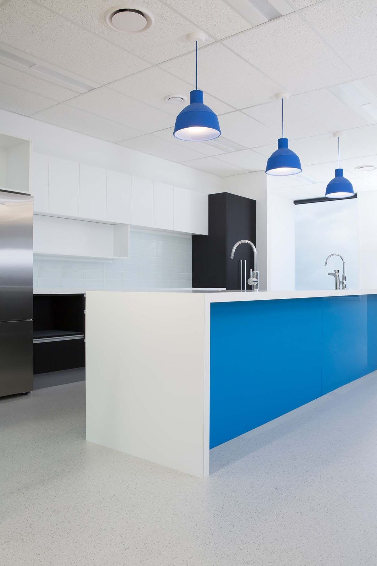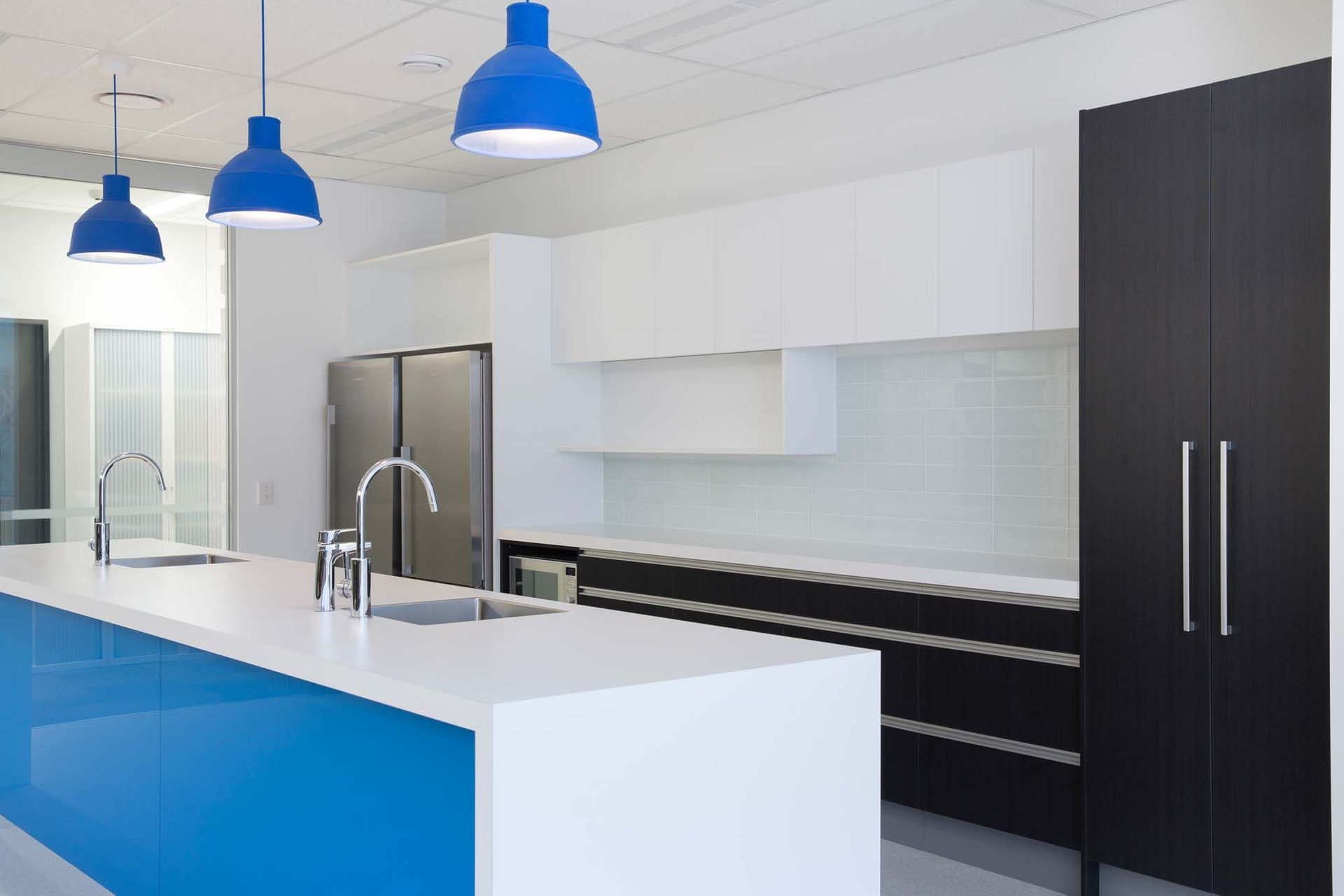 ArchiPro Project Summary - A vibrant and functional staff kitchen at Allied Concrete, featuring a striking mix of Arctic White and Charred Oak finishes, designed to create an inviting hub for employees in Wigram, Christchurch.