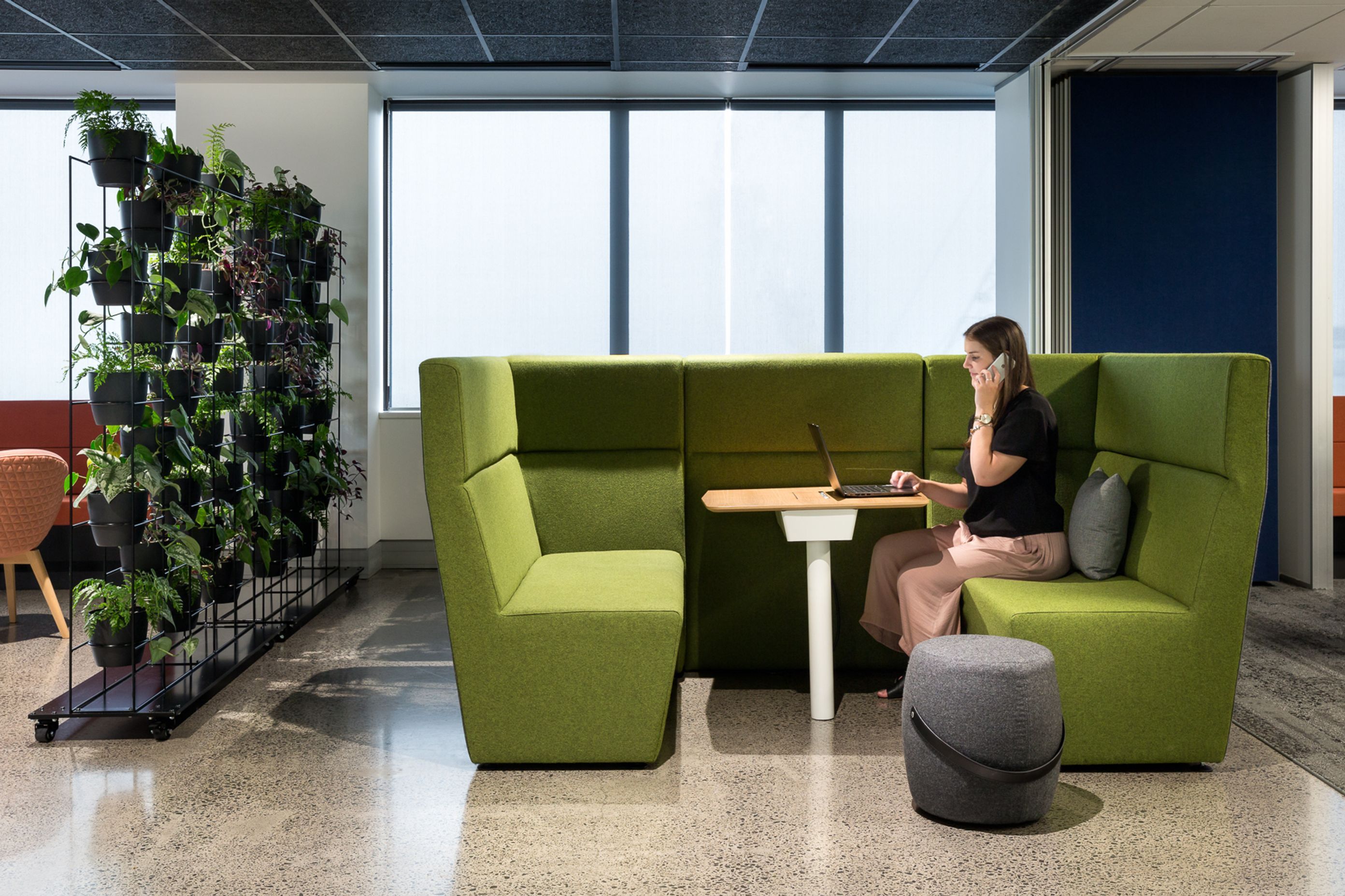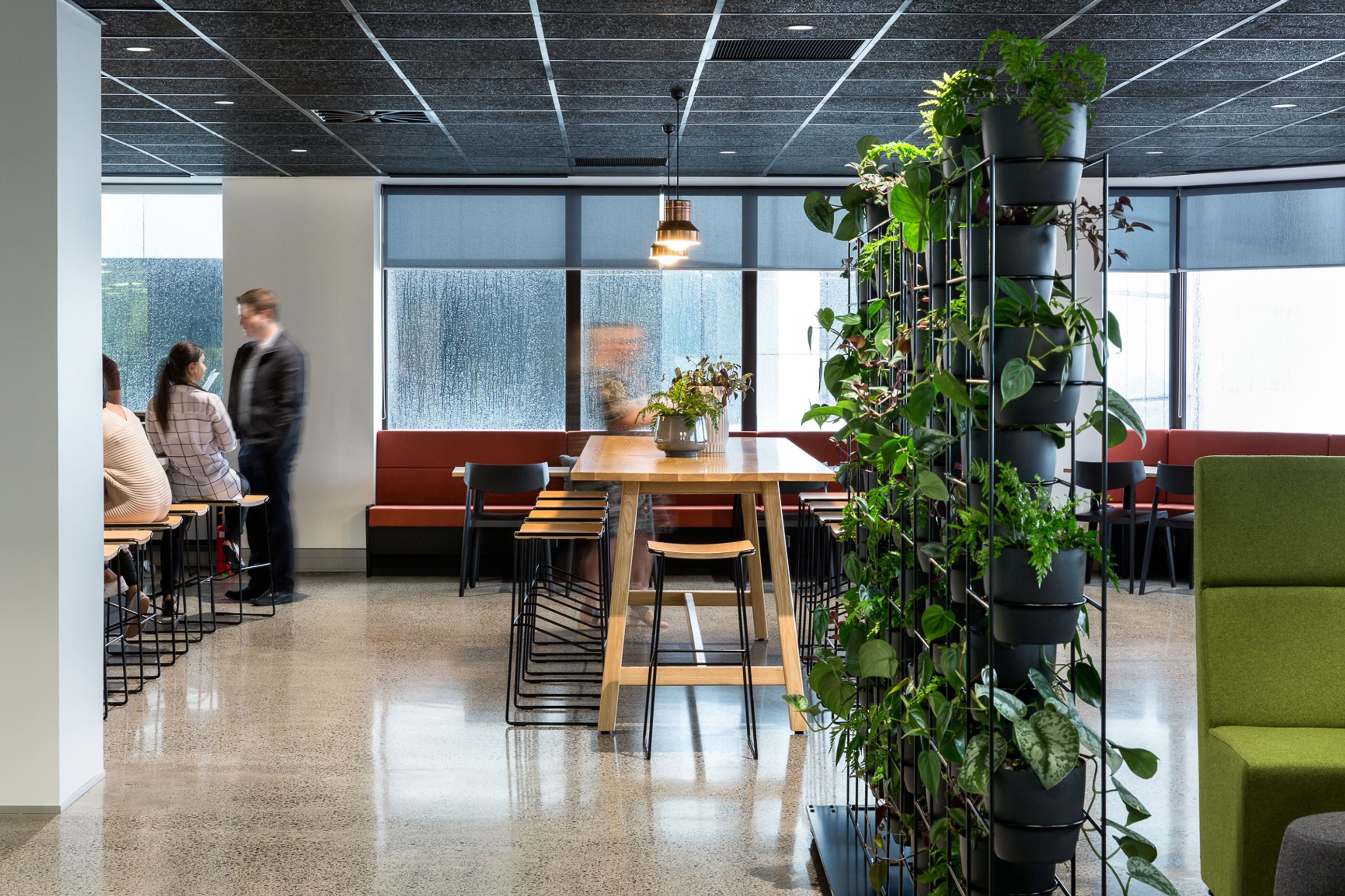 ArchiPro Project Summary - A contemporary staff café at AMP Centre, Auckland, featuring stunning harbour views, innovative industrial design, and versatile spaces for social interaction and meetings.