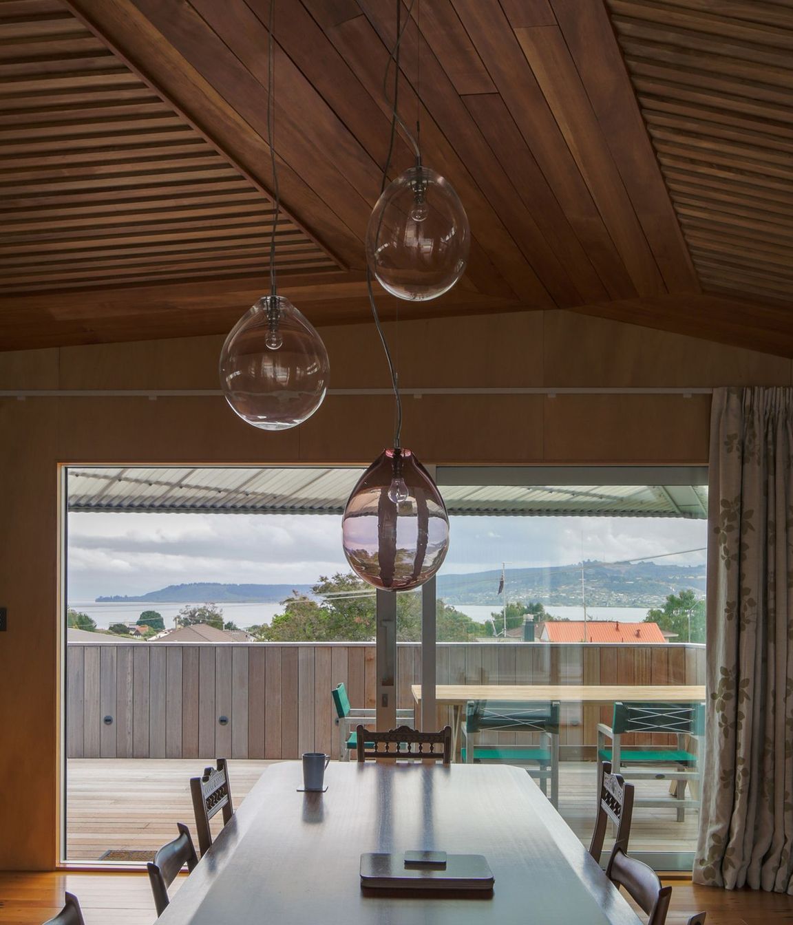 ArchiPro Project Summary - A striking family residence overlooking Lake Taupo, featuring a dynamic design that fosters intergenerational living, complemented by a year-round courtyard and a unique blend of galvanised corrugate and recycled timber interiors.