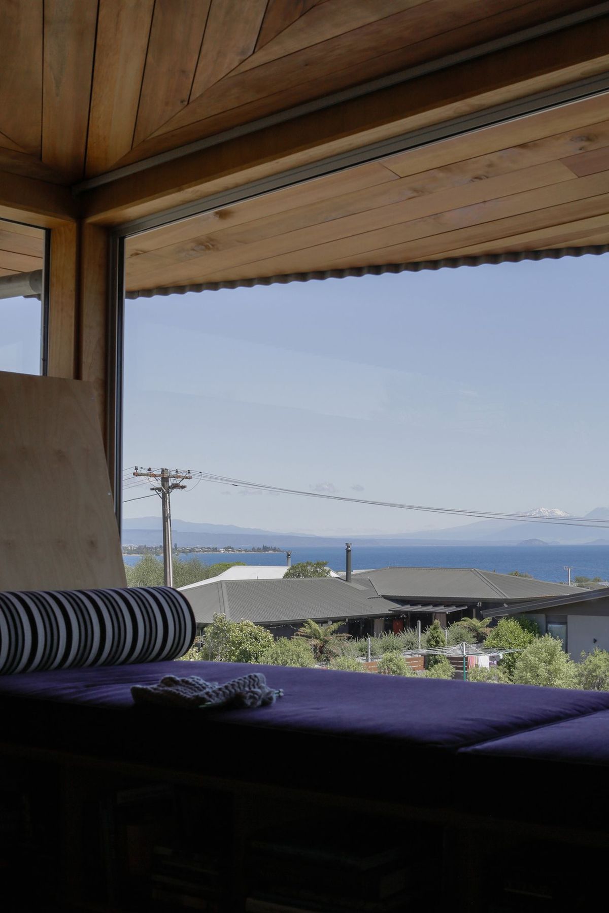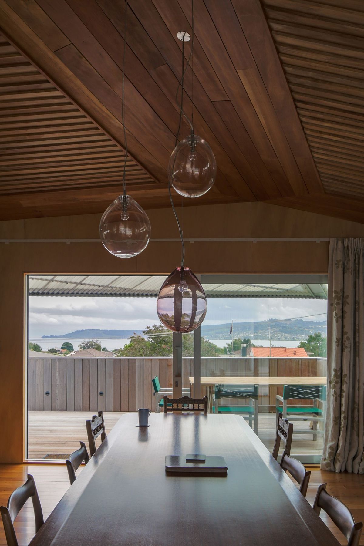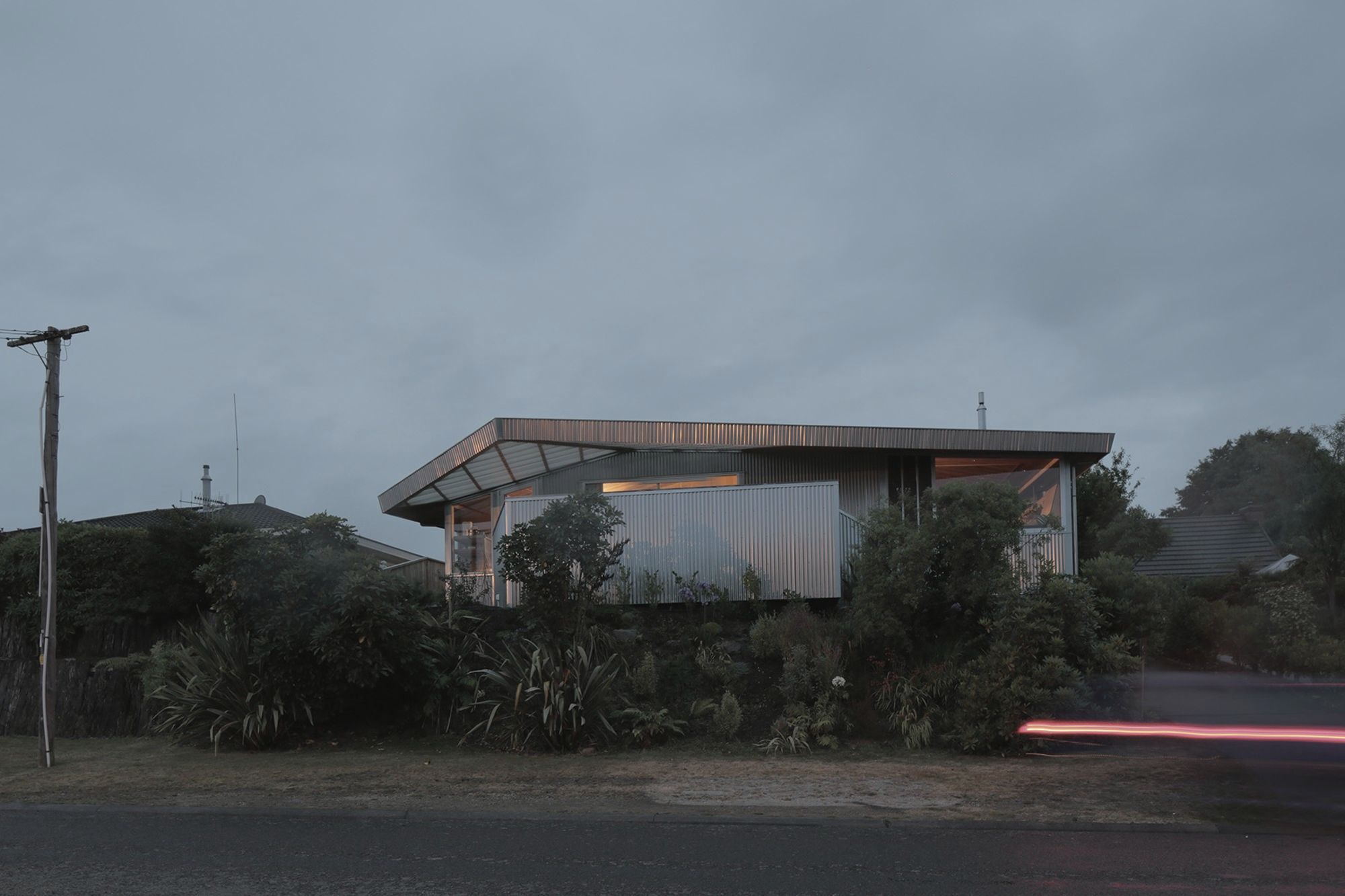 ArchiPro Project Summary - A striking family residence overlooking Lake Taupo, featuring a dynamic design that fosters intergenerational living, complemented by a year-round courtyard and a unique blend of galvanised corrugate and recycled timber interiors.